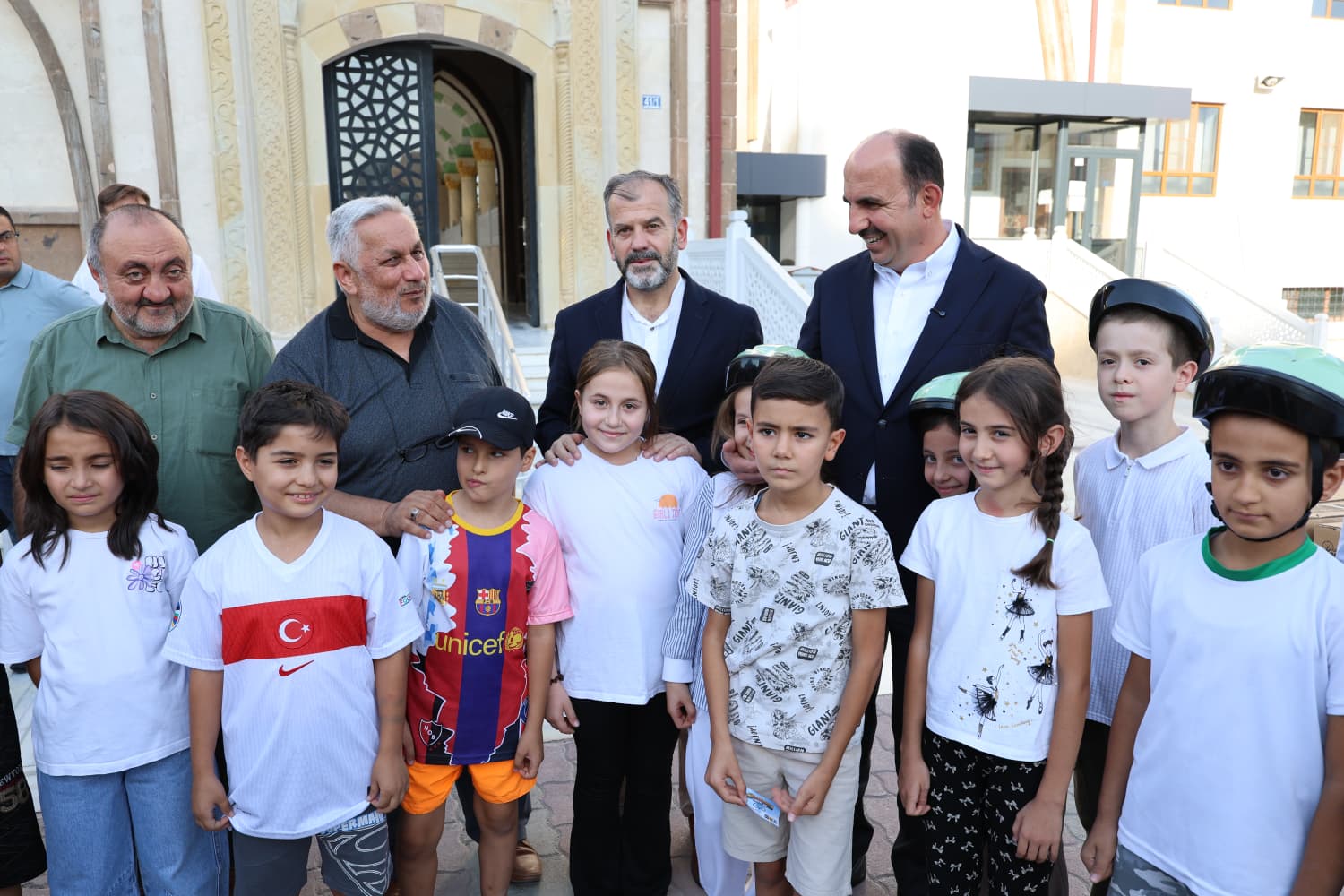 Başkan Altay, Konya İl Müftüsü Ali Öge ile birlikte ilk olarak Sancak Mahallesi’ndeki Sancaktepe Camii’nde, ardından Kosova Mahallesi’ndeki İtisam Anadolu Camii’nde çocukların bisiklet sevincine ortak oldu.