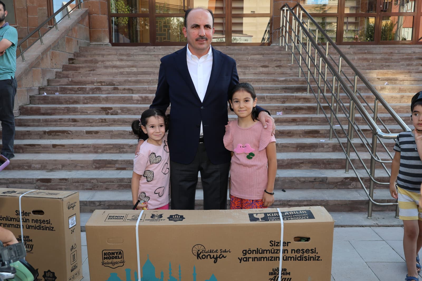 Konya Büyükşehir Belediye Başkanı Uğur İbrahim Altay, “Güle Oynaya Camiye Gel” projesi kapsamında yaz tatilinde bisiklet almaya hak kazanan çocuklara bisikletlerini hediye etti.