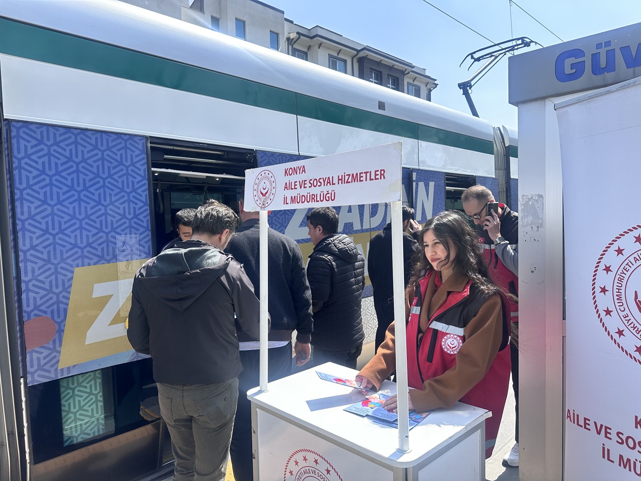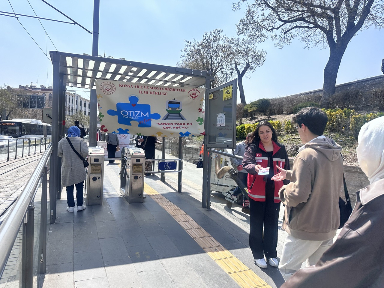 Alaaddin Tramvay Durağı'nda otizm farkındalık standı açan İl Müdürlüğü ekipleri, İl Müdürü Arif Topal ile yolculara otizm hakkında bilgi verdi ve broşür dağıttı.