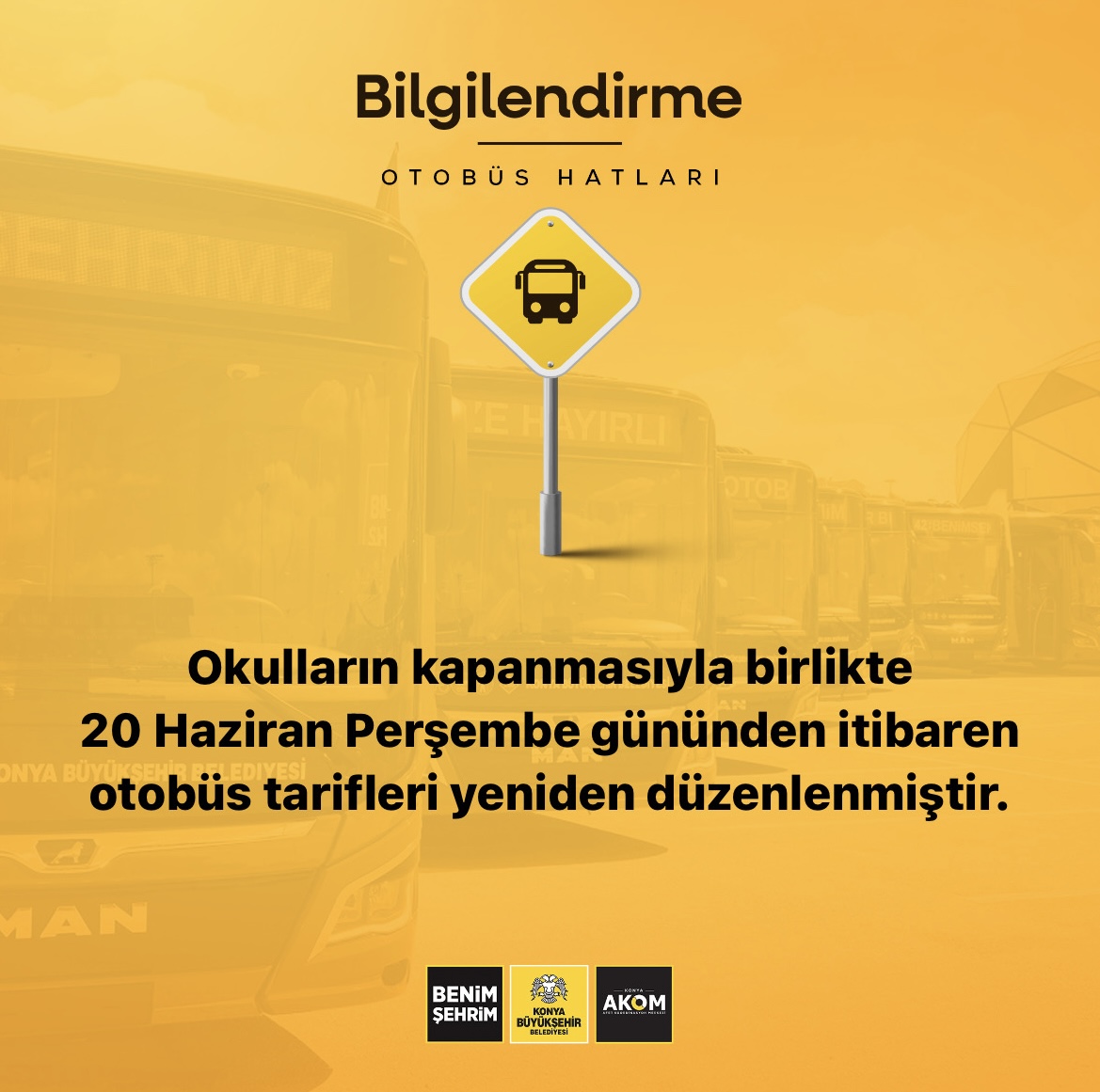 Konya AKOM, okulların kapanmasıyla birlikte 20 Haziran Perşembe gününden itibaren hafta içi otobüs tarifelerinin yeniden düzenlendiğini duyurdu.