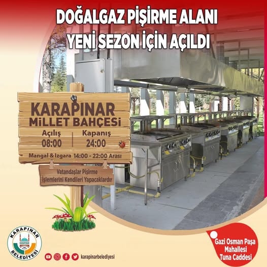 Karapınar Millet Bahçesindeki doğalgaz fırınları 14.00-22.00 saatleri arasında kullanıma açılıyor. Vatandaşlar sebze ve etlerini kendileri pişiriyor. Fırınlı pişirme alanının temizlik ve periyodik bakımı belediye personellerince yapılıyor. Karapınar Millet Bahçesi 08.00-24.00 saatleri arasında misafirlerine hizmet veriyor.