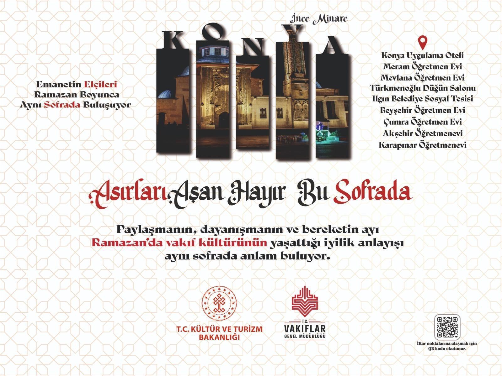 Konya, ramazan ayı boyunca asırlardır süregelen vakıf kültürünün en güçlü örneklerinden birine ev sahipliği yapıyor. “Asırlık Hayır Bu Sofrada” sloganıyla hayata geçirilen organizasyon kapsamında, emanetin elçileri ramazan ayı boyunca aynı sofrada buluşacak.