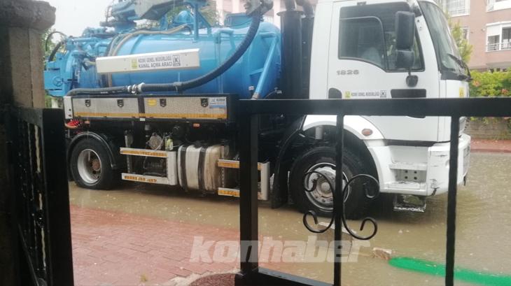 Konya Büyükşehir Belediyesi KOSKİ ekipleri su baskınının yaşandığı bölgeye kanal açma aracı göndererek tıkanan rögarları açmaya çalıştı.