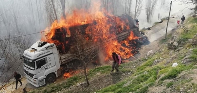 Nuri Altınkaya idaresindeki 42 ETU 36 plakalı saman yüklü tır, ilçeye bağlı Karayusuflu Mahallesinde seyir halindeyken alev aldı.