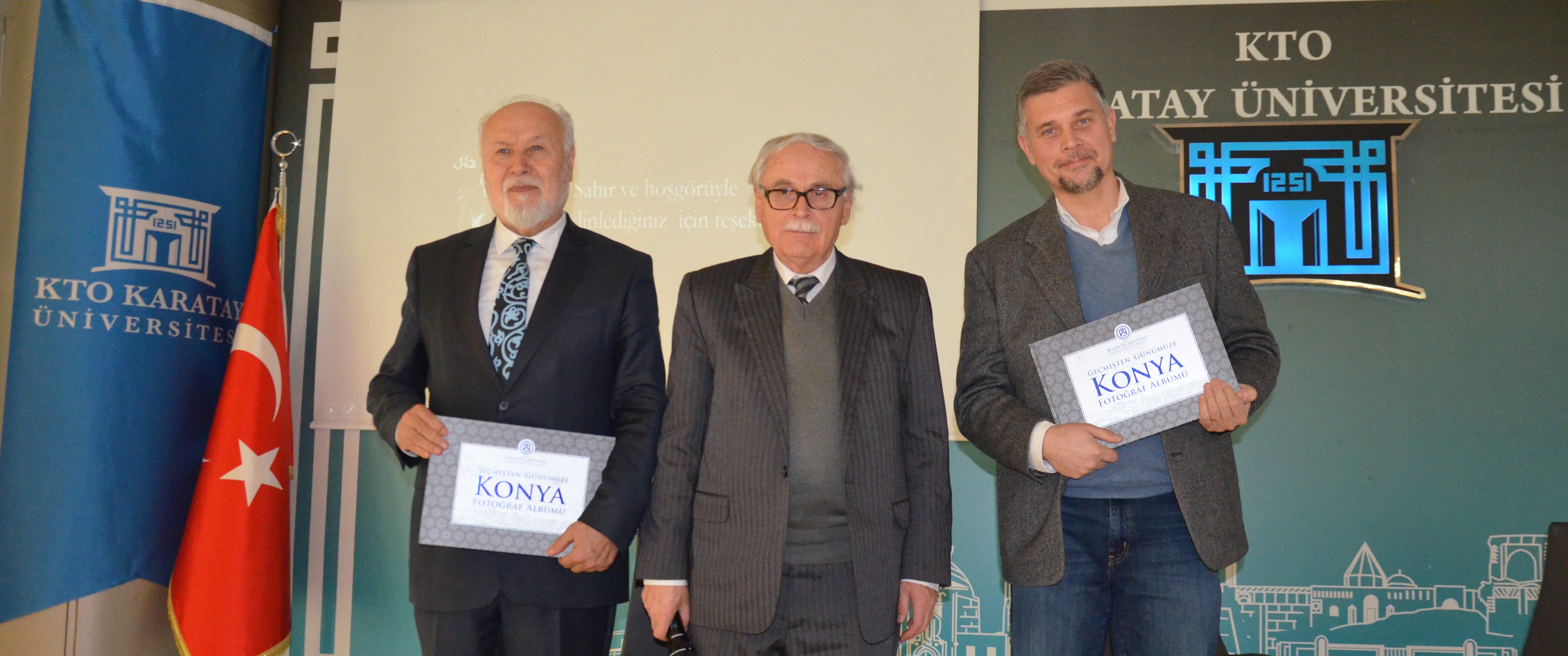 Konferans sonunda Prof. Dr. Yusuf Küçükdağ konferans konuşmacı olarak katılan Selçuk Üniversitesi Emekli Öğretim Üyesi Dr. Yaşar Erdemir ve Çankaya Üniversitesi Öğretim Üyesi Doç. Dr. Mustafa Öngen’e Geçmişten Günümüzü Konya Fotoğraf Albümünü hediye etti.