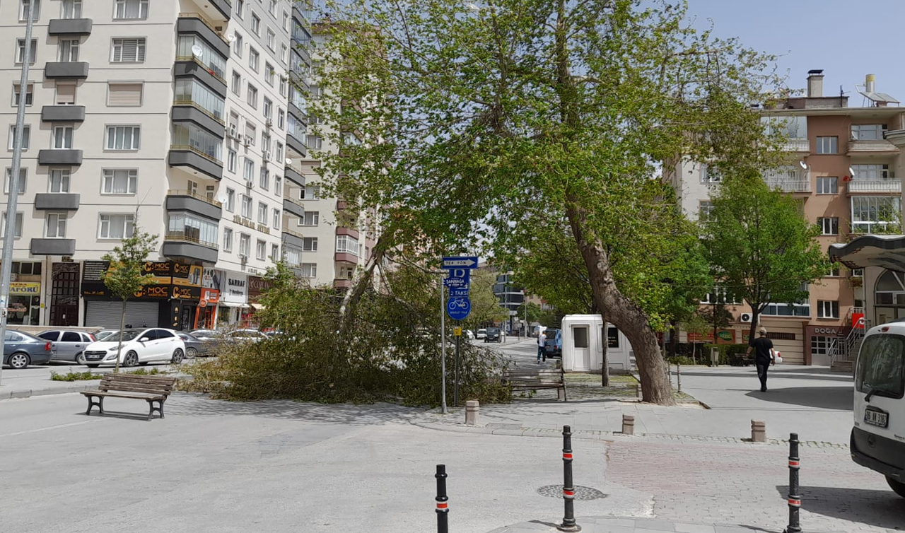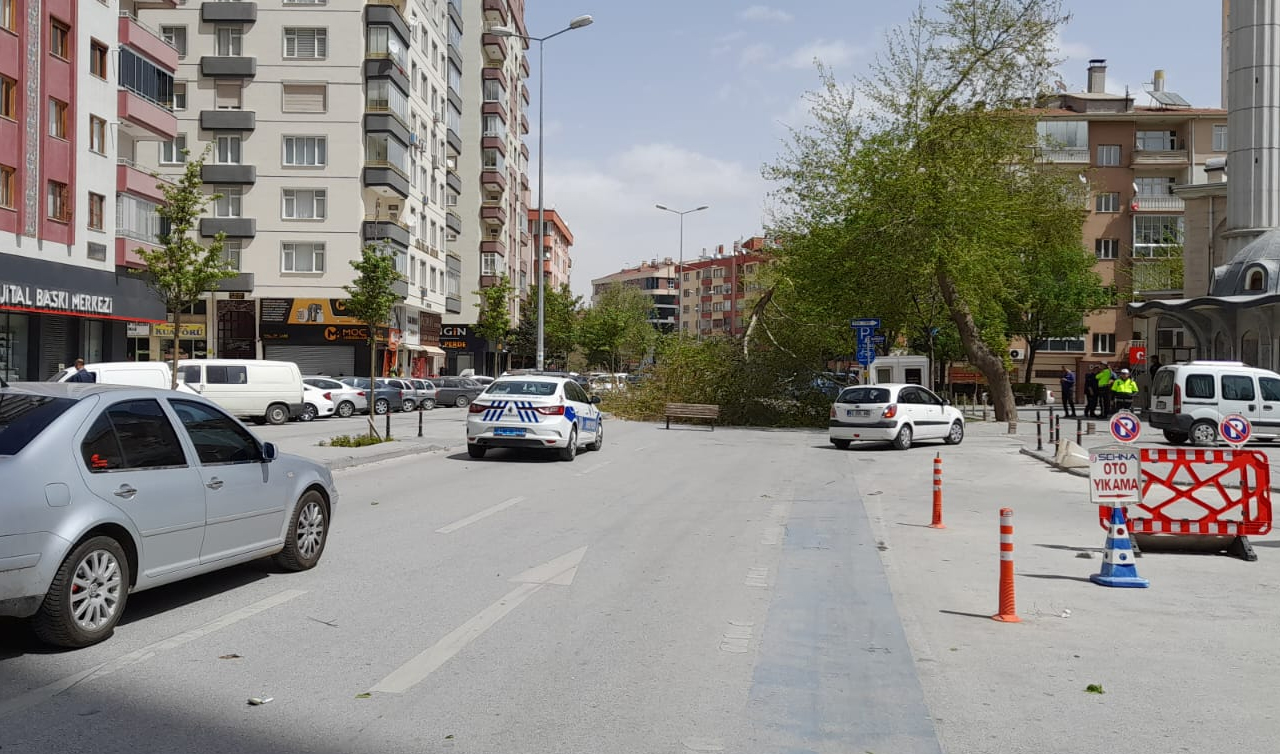 Meteoroloji'nin sarı kodla uyardığı Konya’da kuvvetli rüzgâr etkisini gösteriyor. Merkez Selçuklu ilçesi Hulusi Baybal Caddesi'nde şiddetli rüzgar nedeniyle bir ağaç yola devrildi.