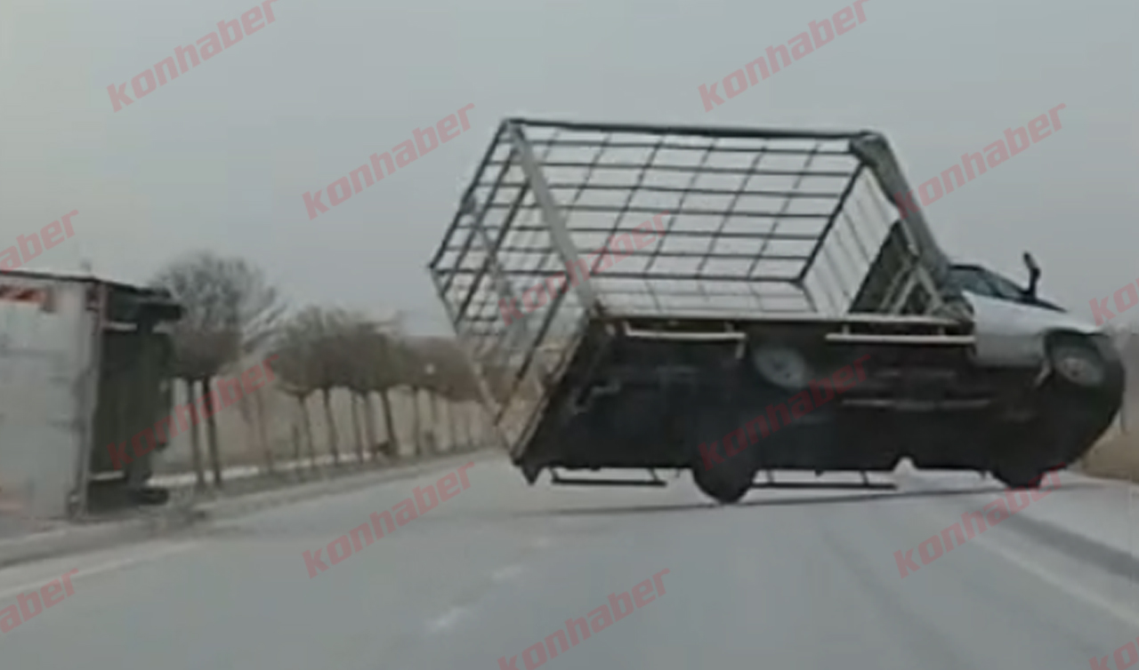 Konya’da etkili olan şiddetli rüzgar hayatı olumsuz etkiliyor. Kuvvetli rüzgar nedeniyle Konya–Karaman yolunda seyir halindeki bir kamyonet devrildi. Kaza anı, aynı güzergahta ilerleyen bir sürücünün cep telefonu kamerasına yansıdı.