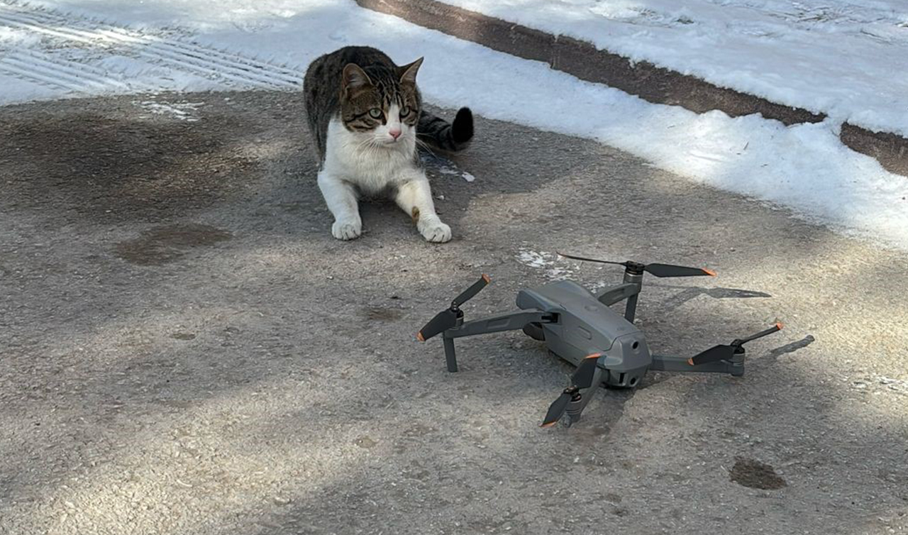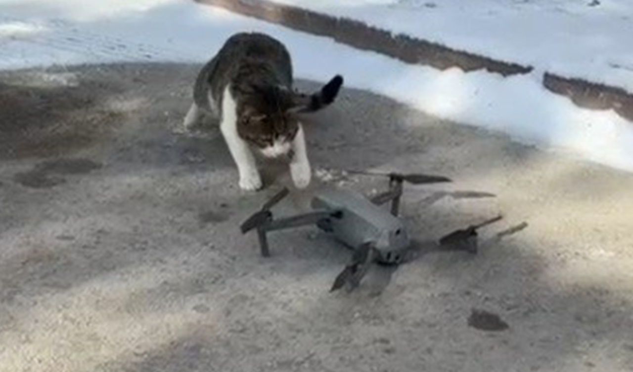 Ancak merakı korkusuna baskın gelen kedi, cihazın yanına geri gelerek zaman zaman pati atarak dron meydan okumaya çalıştı.