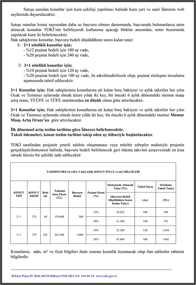 2+1 nitelikli konutlar için yüzde 12 peşinat bedeli için 180 ay vade, yüzde 20 peşinat bedeli için 240 ay vade; 3+1 konutlar için ise yüzde 10 peşinat bedeli için 120 ay vade, yüzde 20 peşinat bedeli için 180 ay vade yapılacak.