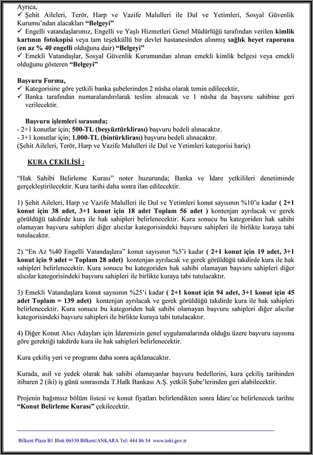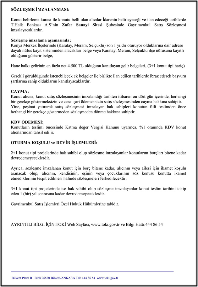 2+1’lerin tahmini satış fiyatının 159 bin 600 lira, 3+1’lerin tahmini satış fiyatının 243 bin 200 lira olduğu konutlar için banka şubelerine başvuru yapmadan önce Konya Büyükşehir Belediyesi internet sitesinden ön başvuru belgesi alarak, Karatay, Meram ve Selçuklu Halk Bankası şubelerine gidilmesi gerekiyor.