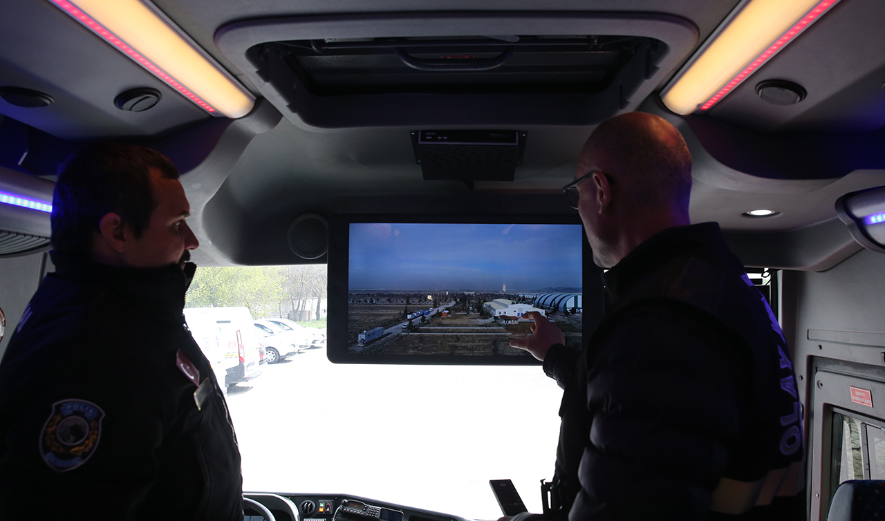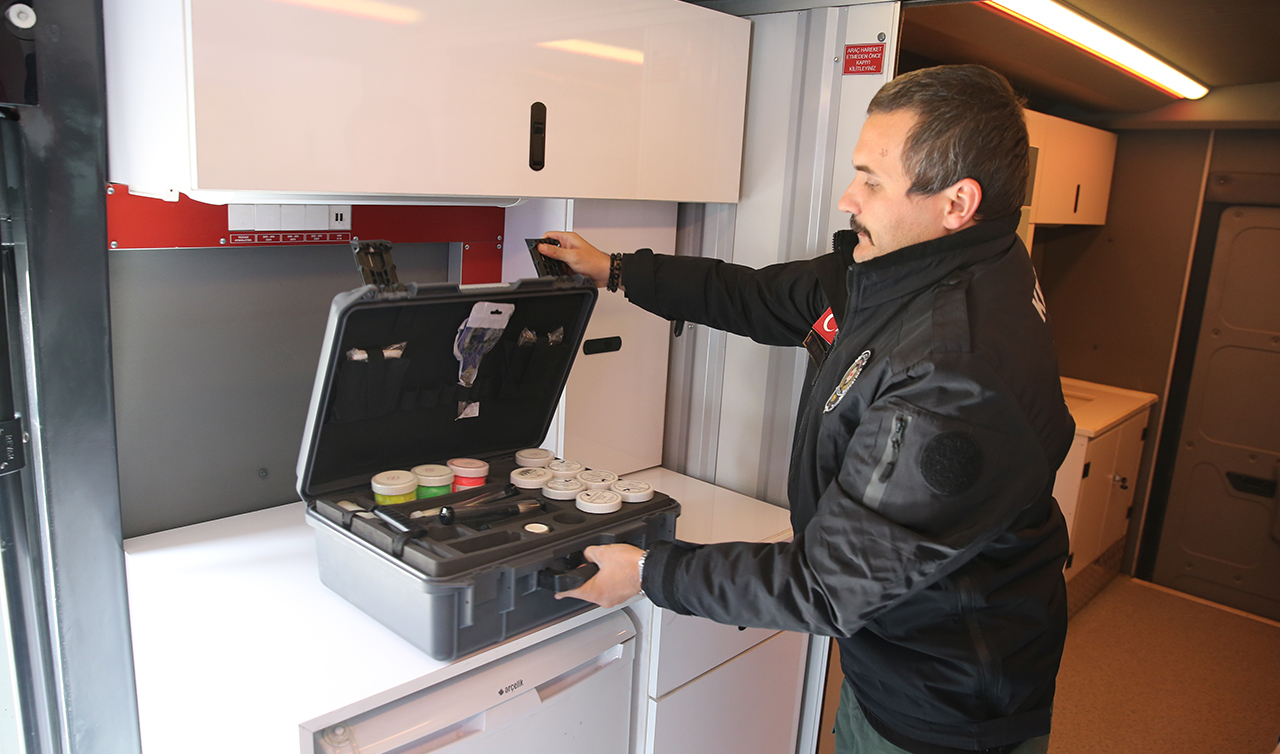 Şubede gerçekleştirilen analiz ve incelemelerin araçta da yapılabildiğine dikkati çeken Gökmen, şöyle konuştu: "Olay çözümlendikten sonra olay yerinde gerekli çalışma yapılıyor. Olayla ilgili herhangi bir bulgu varsa bu araçta incelemeye alınıyor ve tespit edilip sisteme aktarılıyor. Araçta işimizi kolaylaştıracak birçok donanım mevcut. Örneğin 360 derece kamerasıyla olay yeri görüntülerini anlık olarak alıp delillerin yer tespitini çok hızlı şekilde yapıyoruz. Aynı zamanda büyük olaylarda zaman kaybetmek istemiyorsak, içinde konaklamamızı sağlayacak tüm ekipmanlar da mevcut. Bir nevi barınmayı da sağlıyor."