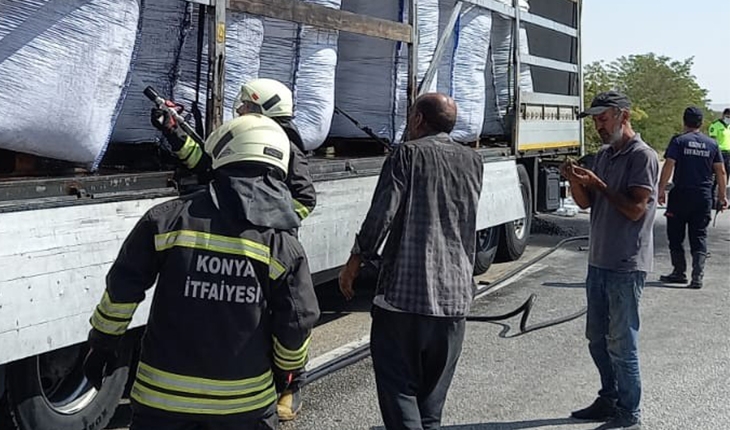 Konya’nın Ereğli ilçesinde, seyir halindeki tırın dorsesinde çıkan yangın itfaiye ekiplerince büyümeden söndürüldü.