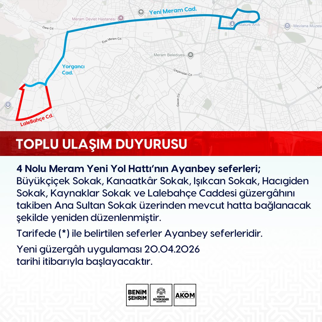 Yeni düzenleme kapsamında otobüsler Büyükçiçek Sokak, Kanaatkar Sokak, Işıkcan Sokak, Hacıgiden Sokak, Kaynaklar Sokak ve Lalebahçe Caddesi güzergâhını takip ettikten sonra Ana Sultan Sokak üzerinden mevcut hatta bağlanacak şekilde hizmet verecek.Konuyla ilgili Konya AKOM'dan yapılan açıklamada, "4 Nolu Meram Yeni Yol Hattı’nın Ayanbey seferleri; Büyükçiçek Sokak, Kanaatkâr Sokak, Işıkcan Sokak, Hacıgiden Sokak, Kaynaklar Sokak ve Lalebahçe Caddesi güzergâhını takiben Ana Sultan Sokak üzerinden mevcut hatta bağlanacak şekilde yeniden düzenlenmiştir. Tarifede (*) ile belirtilen seferler Ayanbey seferleridir. Yeni güzergâh uygulaması 20.04.2026 tarihi itibarıyla başlayacaktır" denildi.