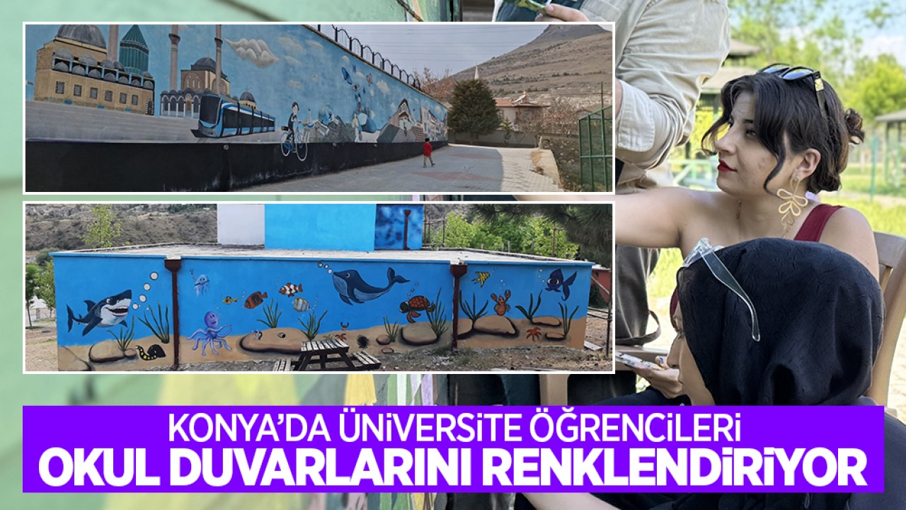 Necmettin Erbakan Üniversitesi (NEÜ) Güzel Sanatlar ve Mimarlık Fakültesi Resim Bölümü öğrencileri, Konya'daki okul duvarlarını yaptıkları resimlerle renklendirmenin yanı sıra uygulamalı eğitimle mesleki deneyim de kazanıyor.