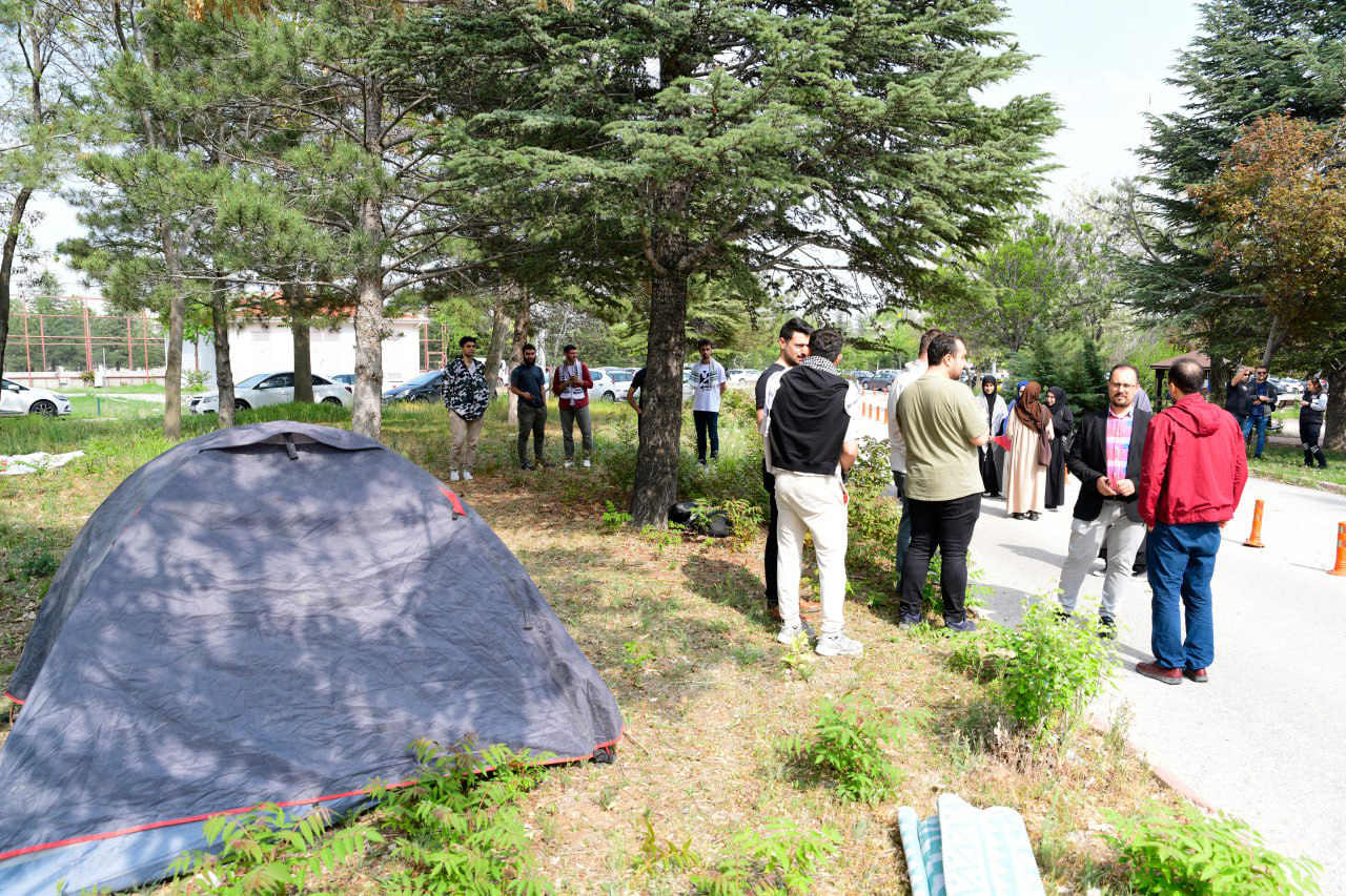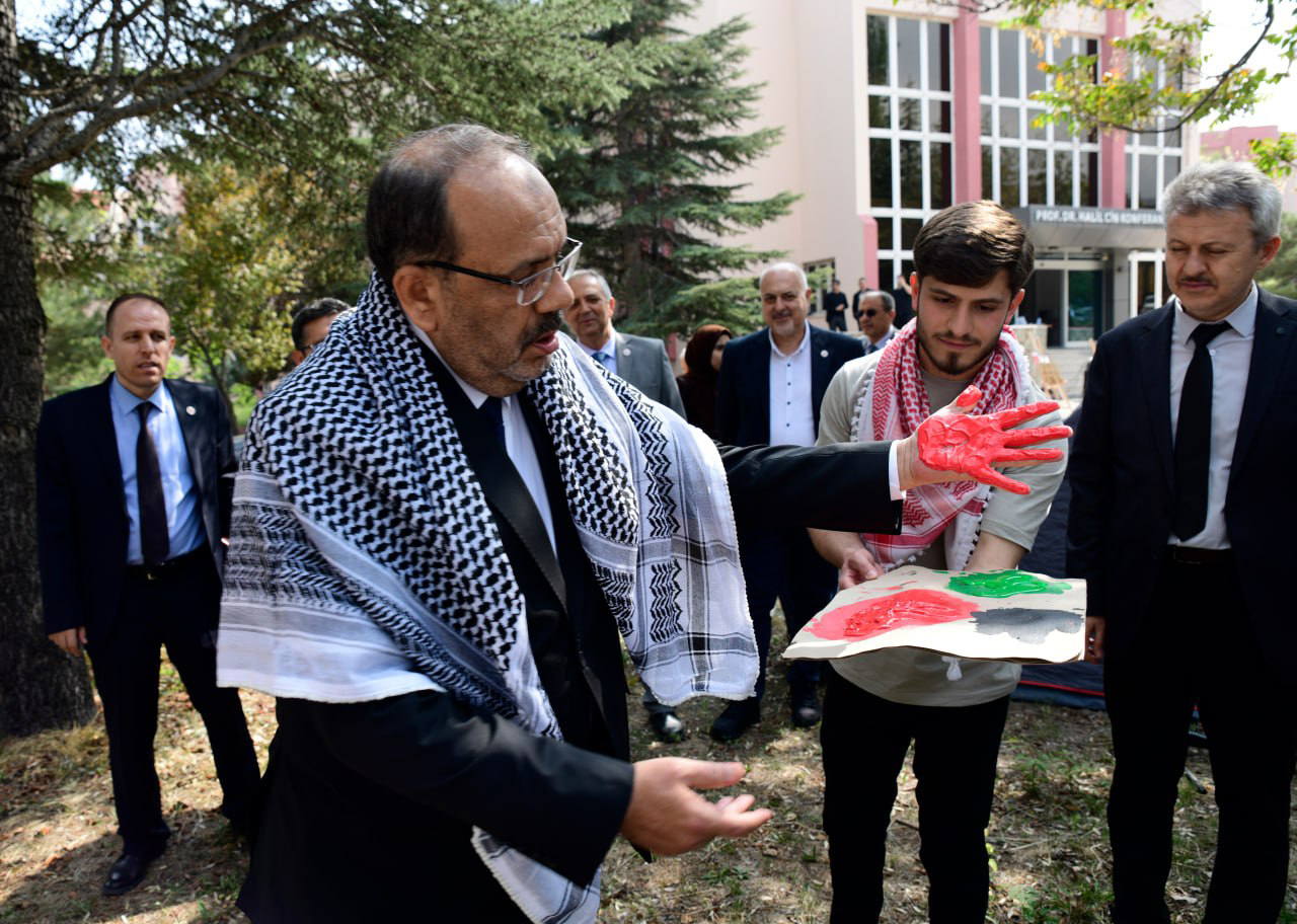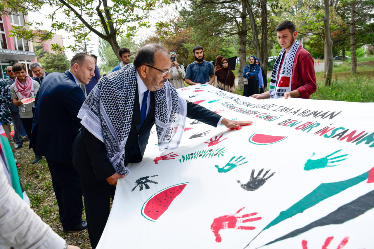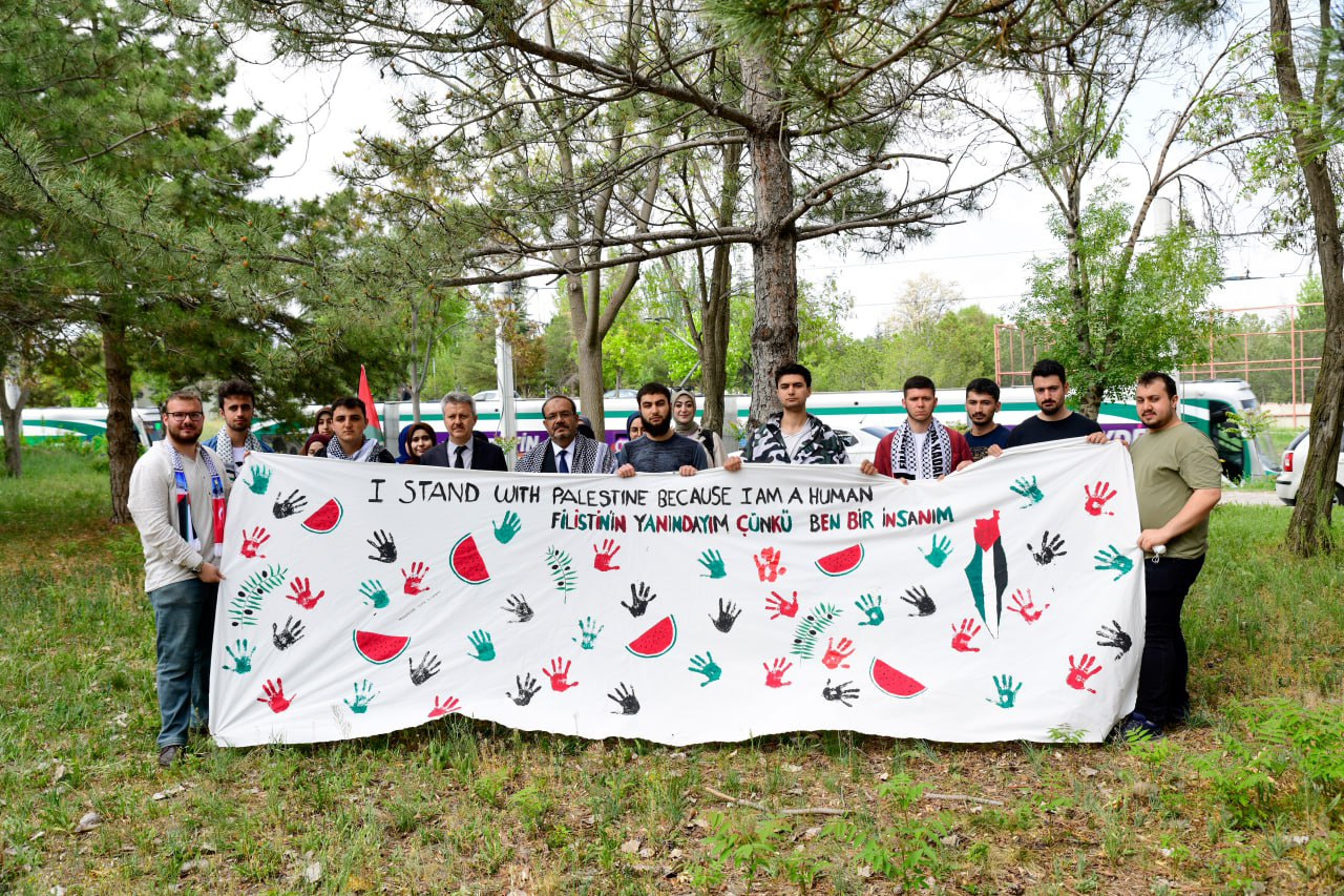 Konya Teknik Üniversitesi (KTÜN) öğrencileri ve akademisyenleri ABD’deki üniversitelerde düzenlenen Filistin eylemlerine okunan basın bildirisiyle destek oldu. KTÜN Mühendislik ve Doğa Bilimleri Fakültesi bahçesinde çadırlar kuran ve Filistin nöbeti tutan öğrencileri ziyaret eden Konya Teknik Üniversitesi Rektörü Prof. Dr. Osman Nuri Çelik basın açıklaması yapan öğrencilerin yanında yer aldı.