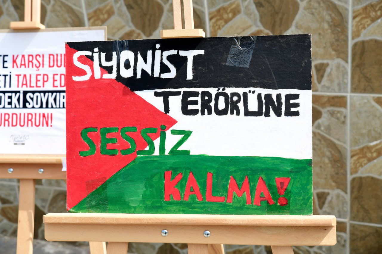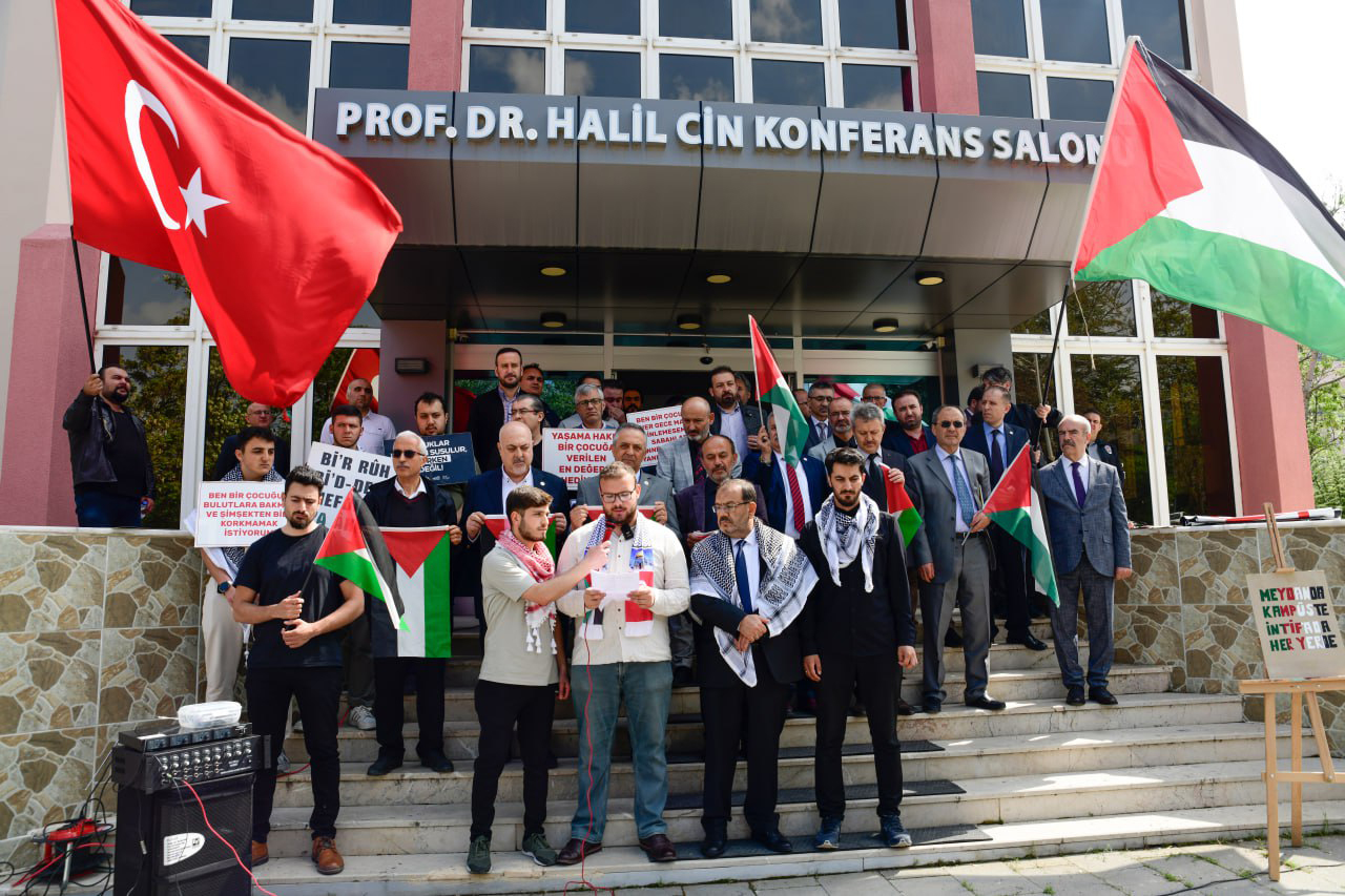Mühendislik ve Doğa Bilimleri Fakültesi bahçesinde bir araya gelen öğrenciler ve akademisyenler, Filistin'e yönelik saldırılara tepki gösterdi, pankartlar ve Filistin bayraklarıyla İsrail'i protesto etti.