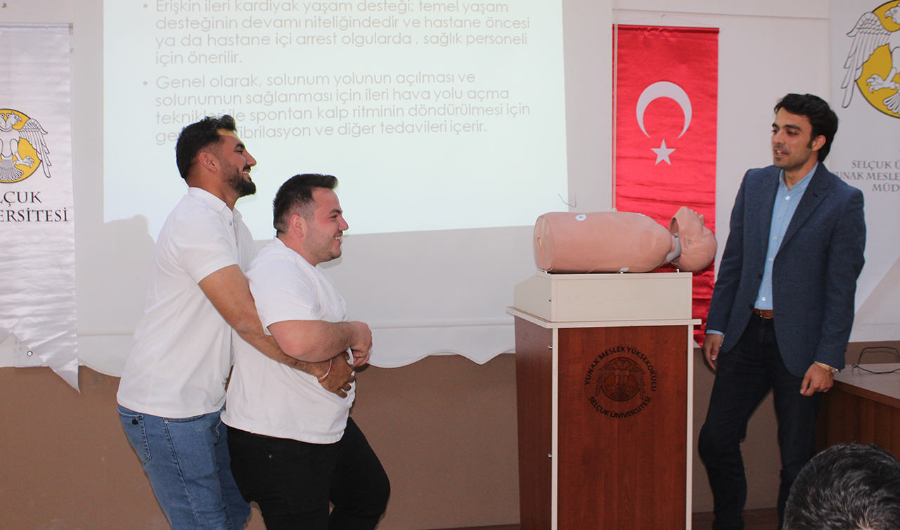 Yunak Devlet Hastanesi Başhekimi Uzman Dr. Atakan Akay, Selçuk Üniversitesi Yunak Meslek Yüksekokulu tarafından gerçekleştirilen eğitimde, öğrencilere temel yaşam desteği, ilk yardım uygulamaları ve Heimlich manevrası gibi konularda eğitim verdi.