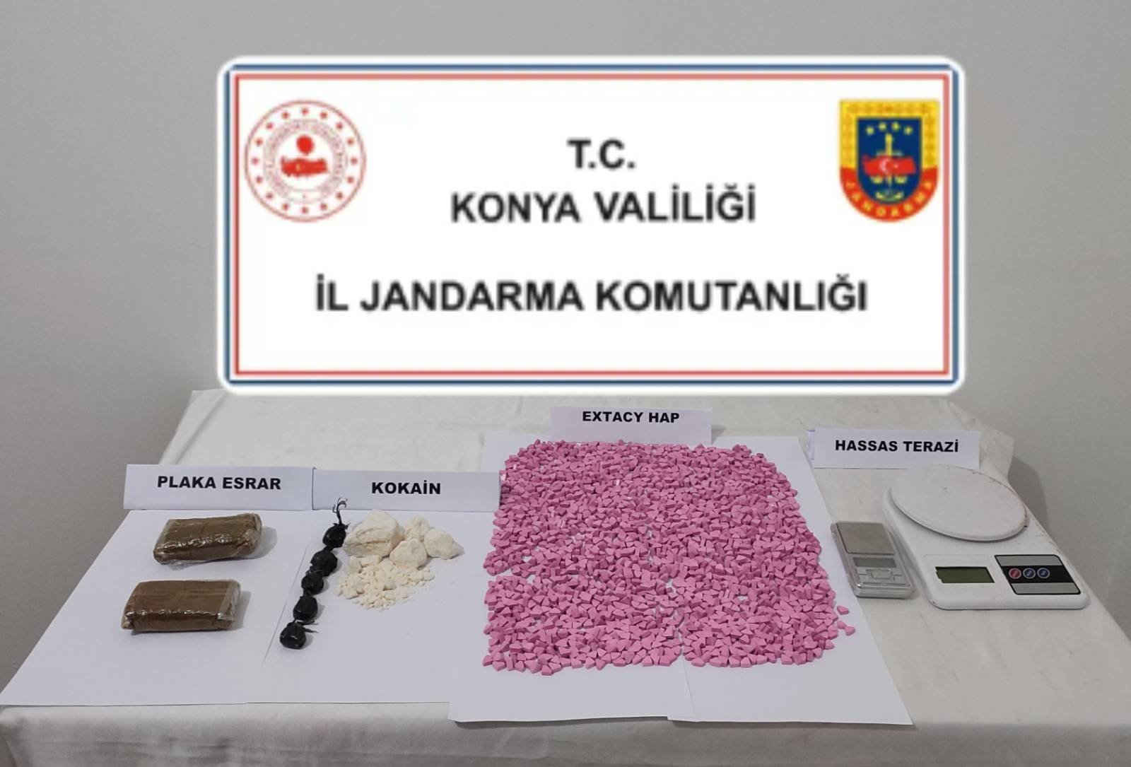 Şahsın adresine yapılan aramada 3 bin 517 adet ekstazi hap, 225 gram kokain, 280 gram esrar ve 2 adet hassas terazi ele geçirildi.