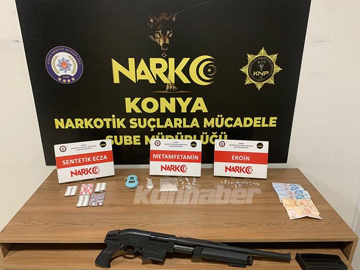Operasyonda evde yapılan aramalarda çeşitli eşyaların içine zulalanmış vaziyette 45 gram Metamfetamin, 45 adet uyuşturucu hap, eroin, bir adet ruhsatsız tüfek, hassas terazi ile uyuşturucu ticaretinden elde edildiği tespit edilen bir miktar para ele geçirdi.