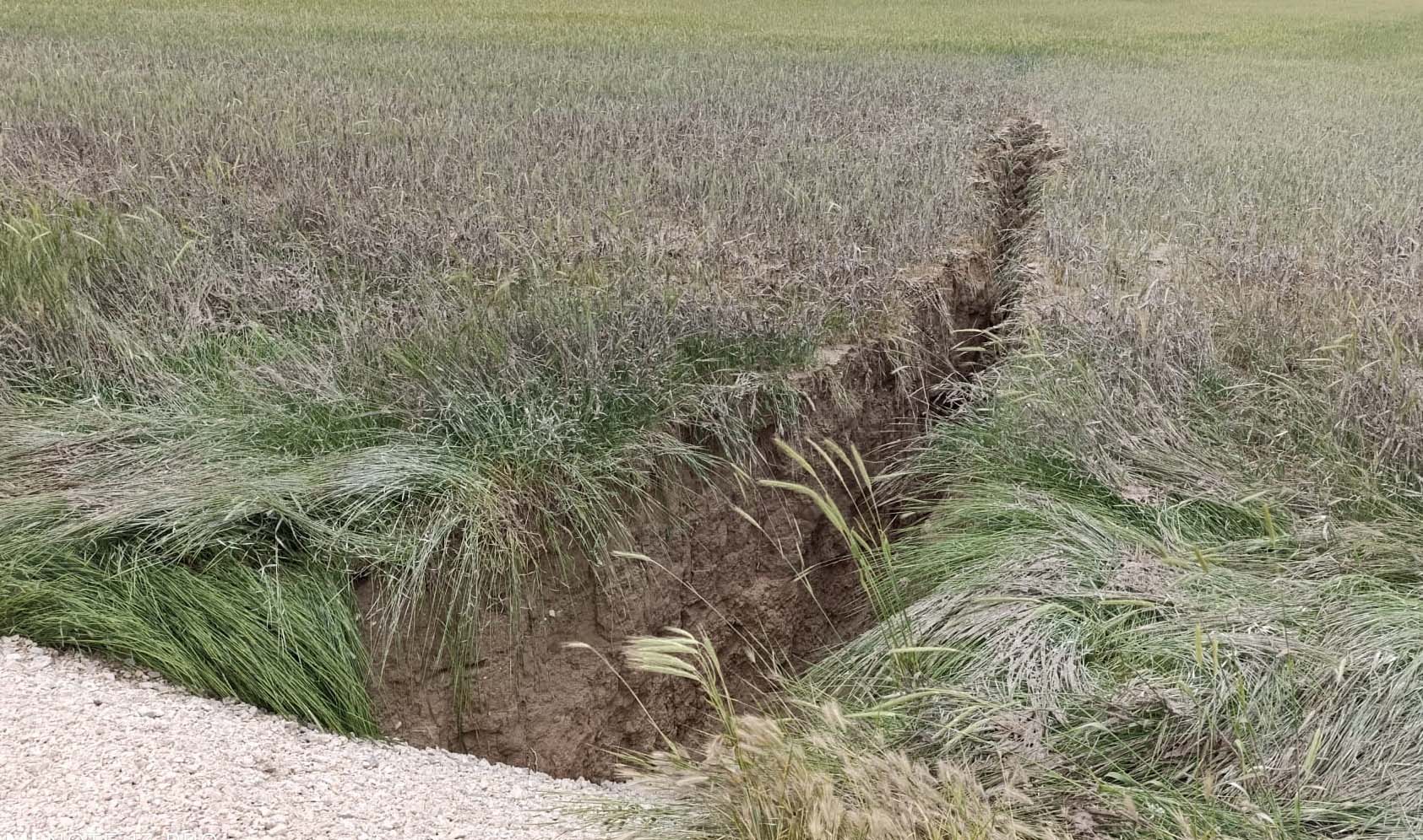 Yoğun yağış sonrası çatlaklıklar büyüyüp, yaklaşık 3-5 metre derinliğinde ve 100 metre uzunluğunda yarık oluştu. Yarık, buğday tarlasından başlayıp, yolun altından, pancar tarlasında ilerliyor. Bu durumu fark edince belediye ekiplerine haber verdik. Ekipler, yolun tadilatını yaptı. Tarlamız da bu hale dönüştü." dedi.