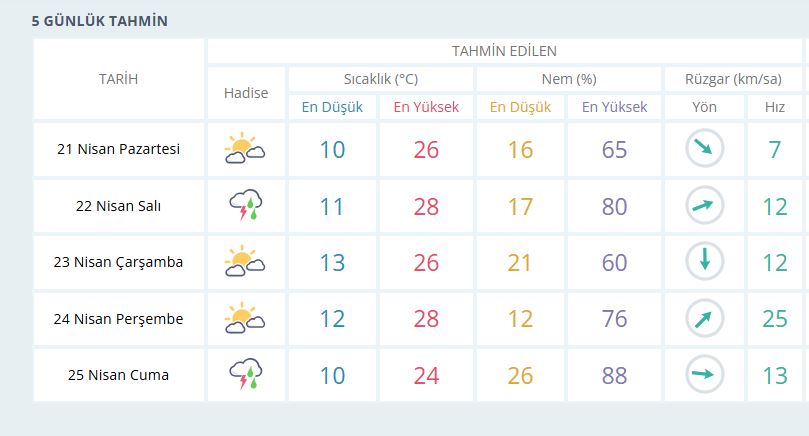 21 Nisan Pazartesi, 23 Nisan Çarşamba ve 24 Nisan Perşembe günü havanın parçalı bulutlu olması tahmin ediliyor. Bununla birlikte sıcaklıklarda da artış söz konusu. Öte yandan haftanın en düşük sıcaklığının ise cuma günü yaşanması bekleniyor.