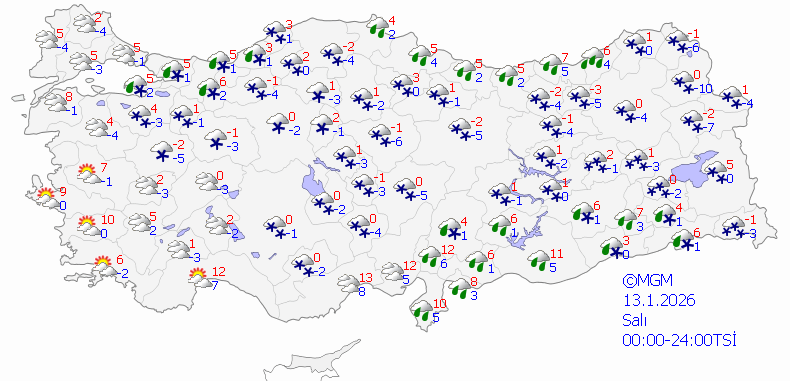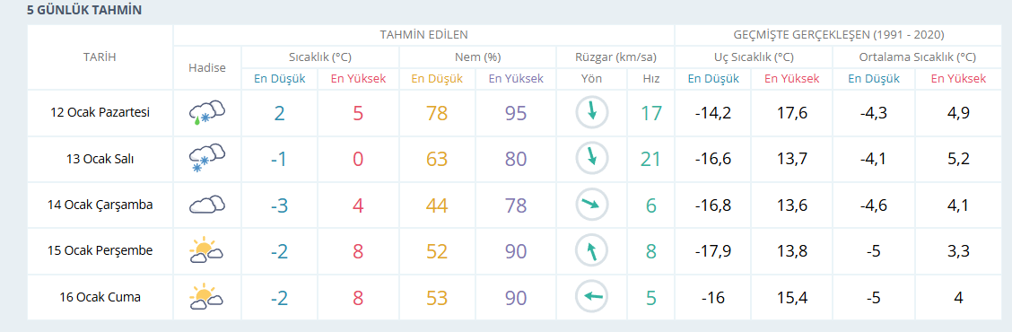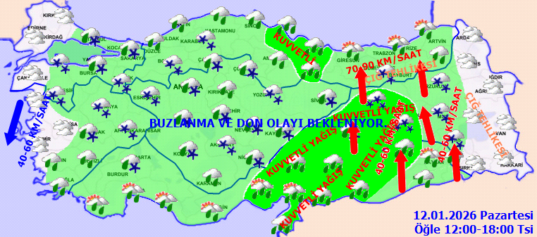 Yetkililer, özellikle 12 Ocak Pazartesi ve 13 Ocak Salı günlerinde karla karışık yağmur ve yer yer kar yağışı görülebileceğini belirterek vatandaşları dikkatli olmaları konusunda uyardı.