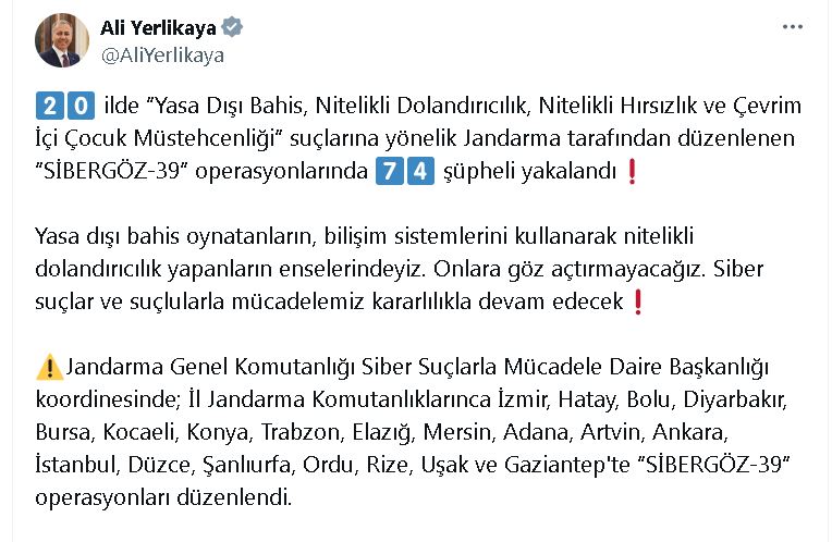 İçişleri Bakanı Ali Yerlikaya, Konya dahil olmak üzere 20 ilde “Yasa Dışı Bahis, Nitelikli Dolandırıcılık, Nitelikli Hırsızlık ve Çevrim İçi Çocuk Müstehcenliği” suçlarına yönelik Jandarma tarafından düzenlenen “Sibergöz-39” operasyonlarında 74 şüphelinin yakalandığını açıkladı.