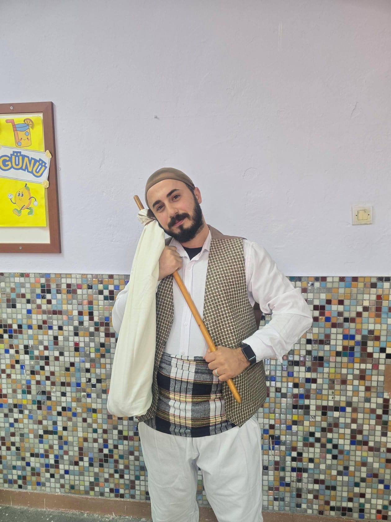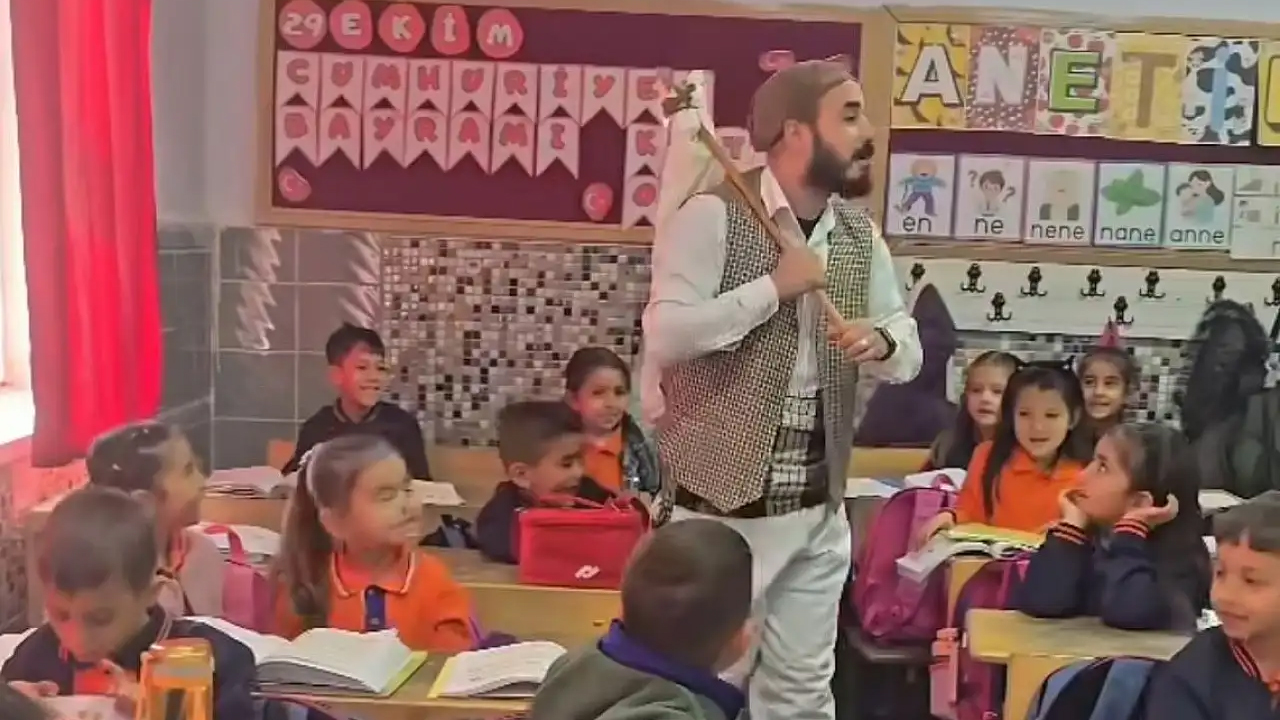 “K” harfini anlatmak için Keloğlan kostümü giyen Kamil öğretmen, öğrencilerine unutulmaz bir deneyim yaşattı. Renkli görüntüler sosyal medyada da büyük beğeni topladı.
