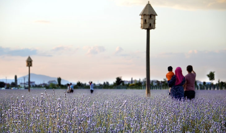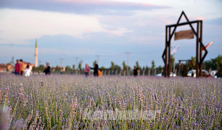 Ziyaretçiler özel objelerle oluşturulan dekorlar ve göz alıcı renklerdeki lavanta bahçelerinde fotoğraf çektirmek için sıra bekliyor.