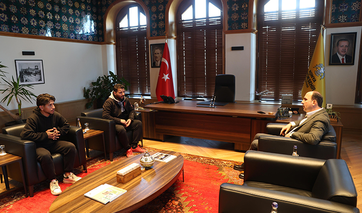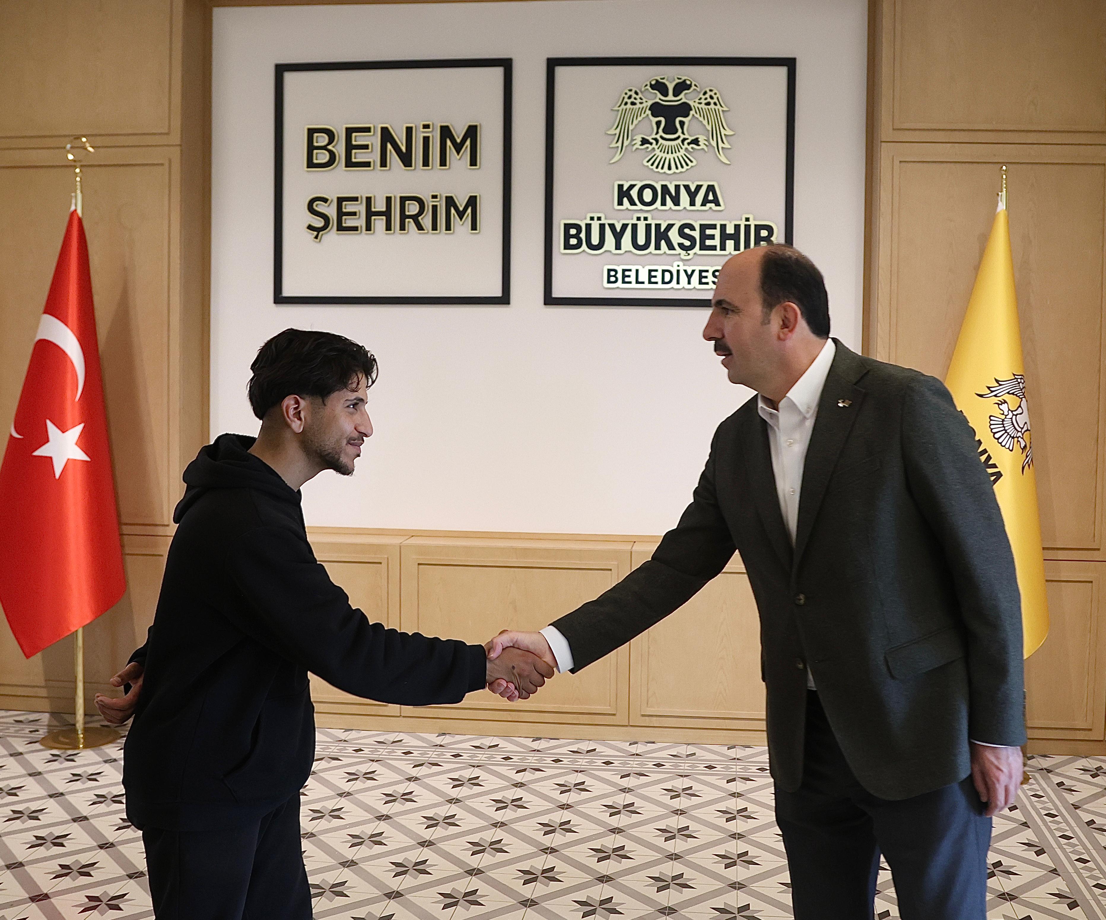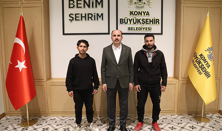 Konya Büyükşehir Belediye Başkanı Uğur İbrahim Altay, Selçuk Mahallesi’nde 4 katlı bina çökmeden önce durumu fark ederek tüm dairelerin kapılarını çalan ve insanların dışarı çıkmasını sağlayan Ali El Hüseyin (20) ile abisi Muhammed El Hüseyin’i ağırladı.