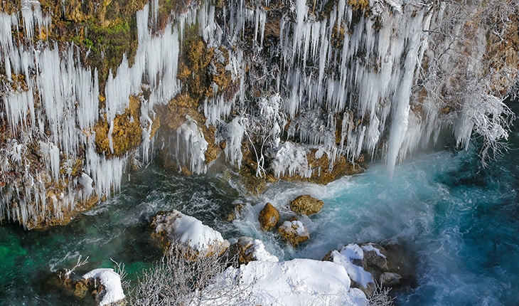 Hava sıcaklığının mevsim normallerinin altında seyretmesi nedeniyle şelalede oluşan buz sarkıtları ve su buharı görsel şölen sunuyor.