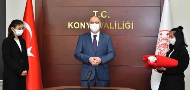 Konya Valiliğinde Vali Vahdettin Özkan’ın katılımıyla düzenlenen törende Karaman’dan İlimize gelen Şanlı Bayrağımız, Aile Çalışma ve Sosyal Hizmetler Bakanlığına bağlı kuruluşlarında kalan gençlerimiz Esma Hatun Eser tarafından temsilcimiz Ezgi Ünüvar’a teslim edildi.
