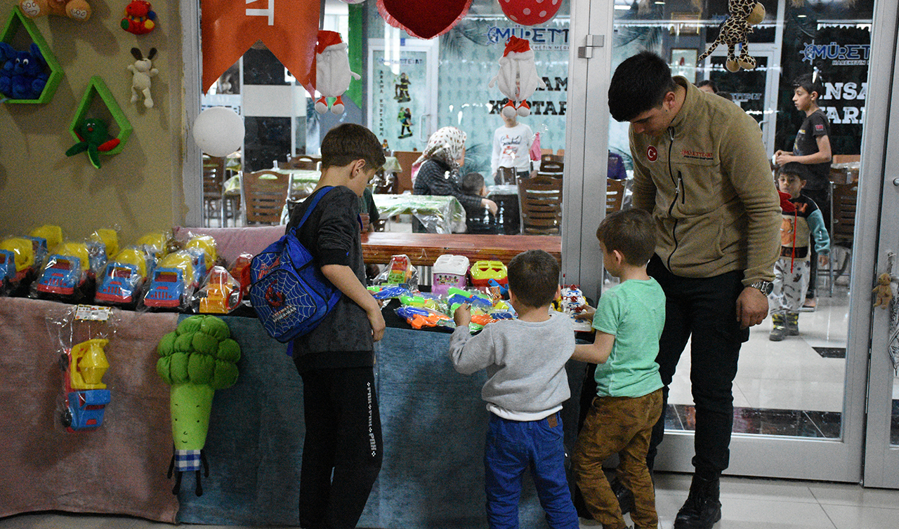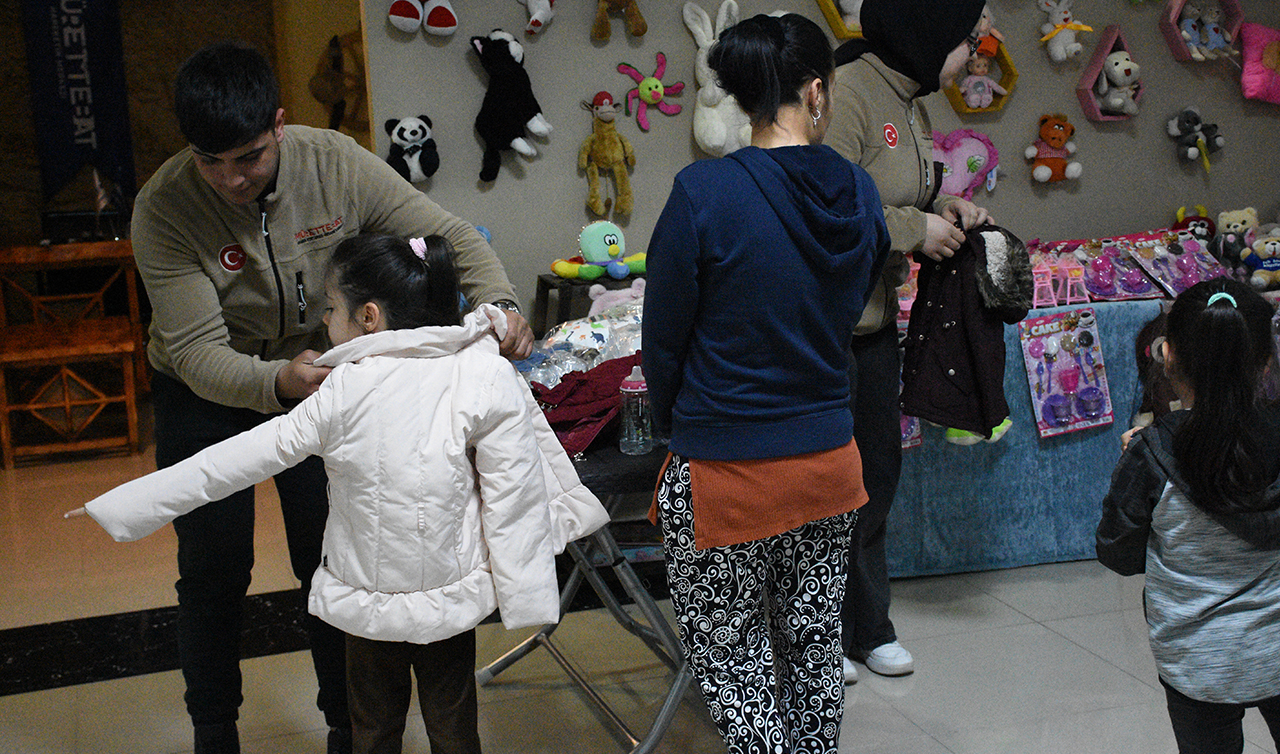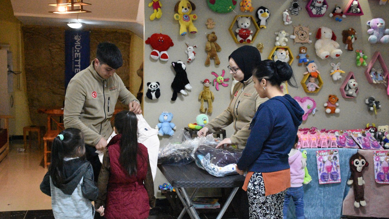 Aileler, Mürettebat Arama Kurtarma ve Uluslararası Strateji Derneği binasında kurulan "Sevgi Mağazası"ndan ayakkabı, mont, oyuncak gibi ihtiyaçlarını karşılayabiliyor.
