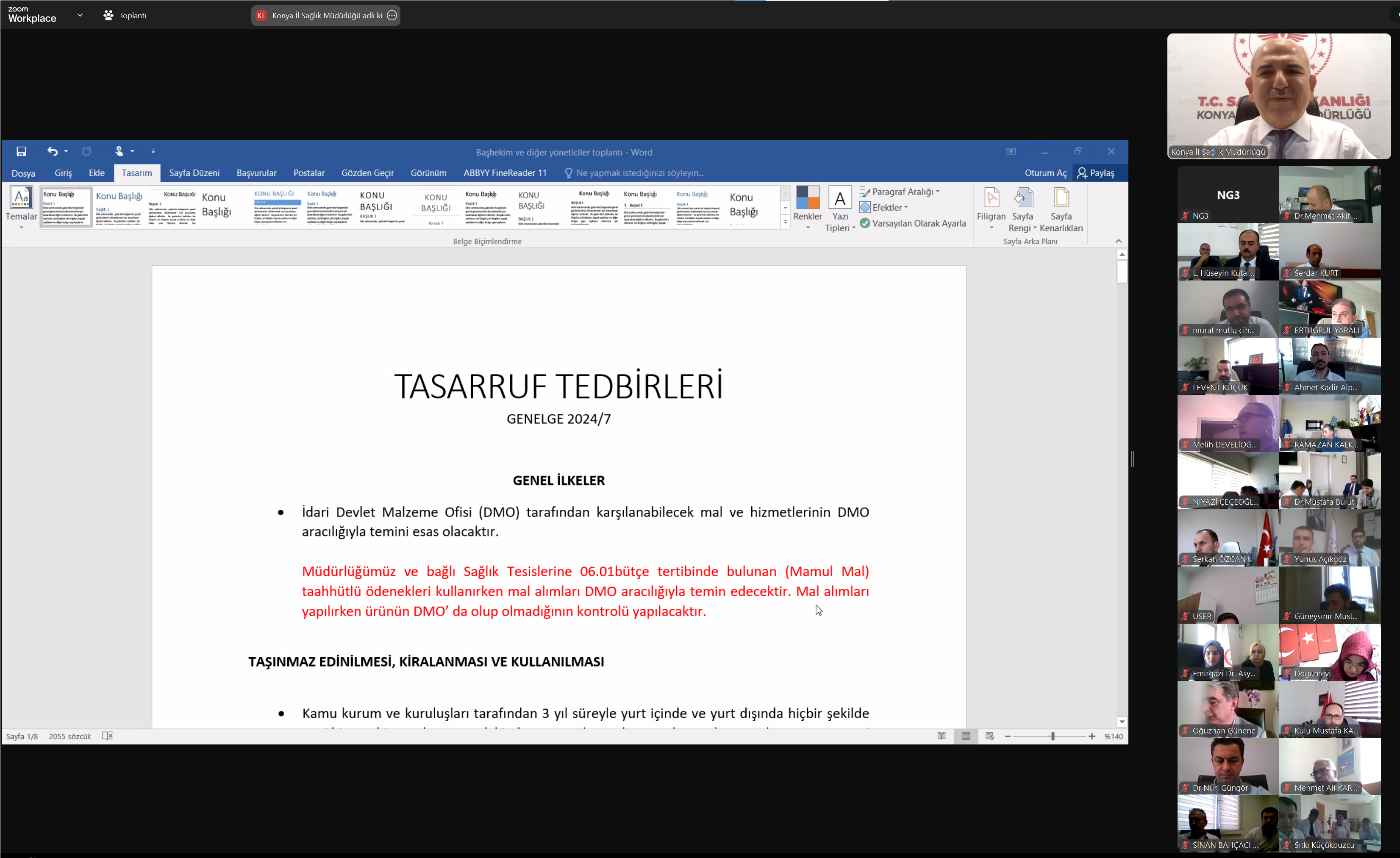 İl Sağlık Müdürü Prof. Dr. Mehmet Koç, merkez ve ilçe hastanelerin başhekim ve idarecileri ile telekonferans görüşmesi gerçekleştirdi. Hizmet başkan ve yardımcılarının da hazır bulunduğu toplantıda, kamuda uygulanacak olan tasarruf tedbirleri ile Kurban bayramı öncesi ve bayram tatili döneminde hastanelerde alınan önlemler detaylı bir şekilde değerlendirildi.