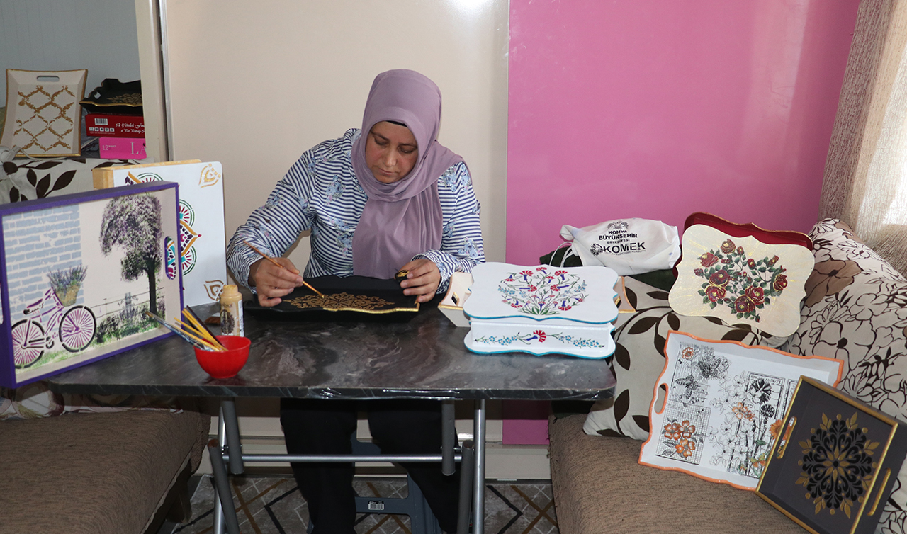 Konya Konteyner Kent 3'üncü etapta kalan 2 çocuk annesi Fatma Yılmaz (35) da tamamladığı ahşap boyama kursu sayesinde kendisini geliştirerek, çeşitli ürünler yapmaya başladığını ifade etti.