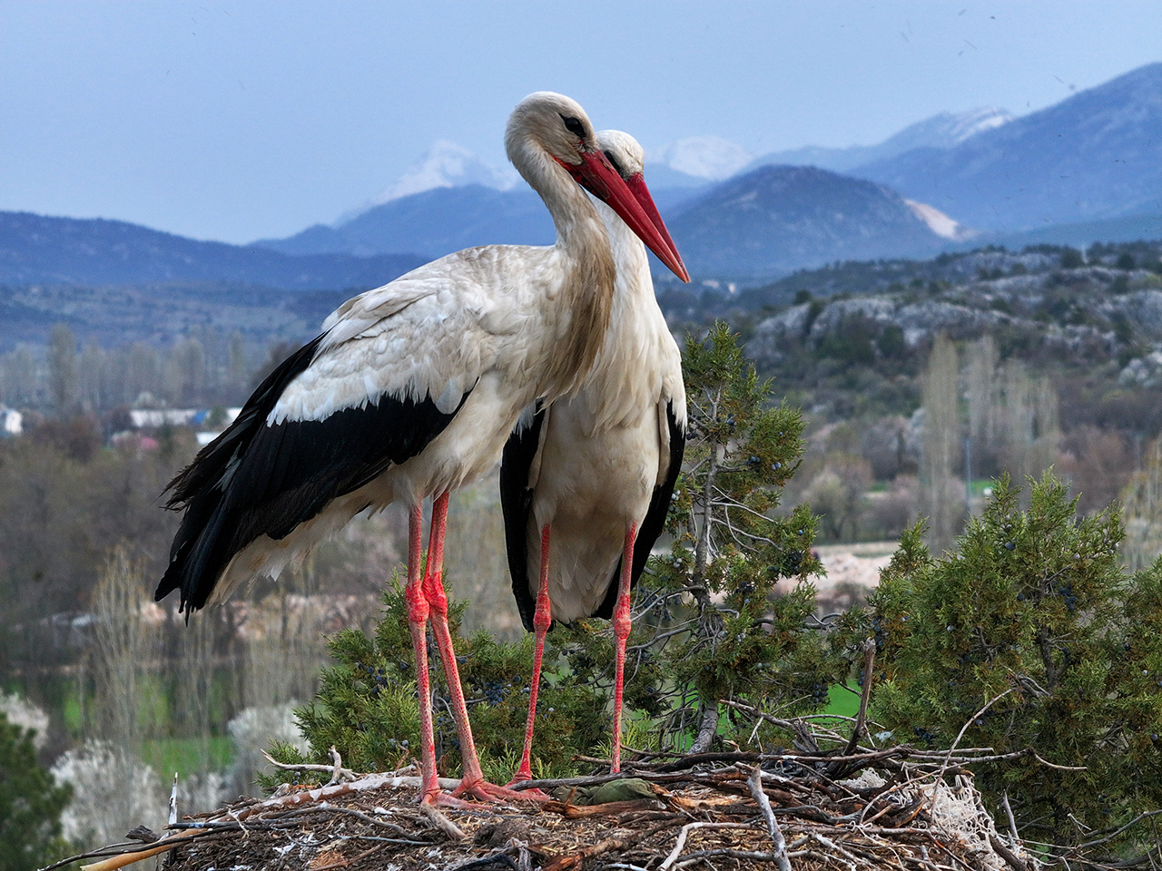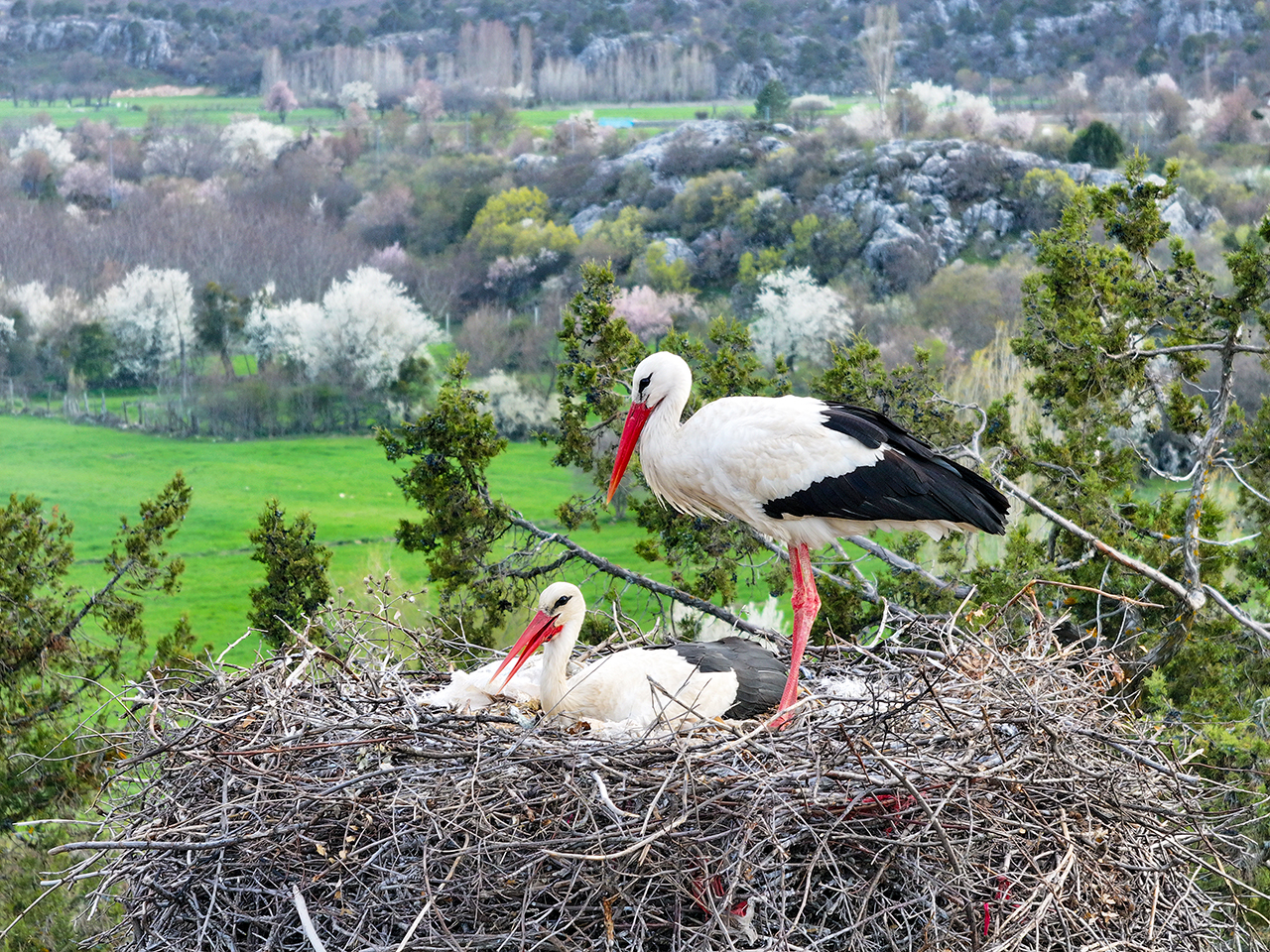 Konya'nın Beyşehir ilçesindeki Leylekler Vadisi'nde konaklayan leylekler, yumurtalarını dişi ve erkek bireylerin dönüşümlü kuluçkaya yatmasıyla koruyor.