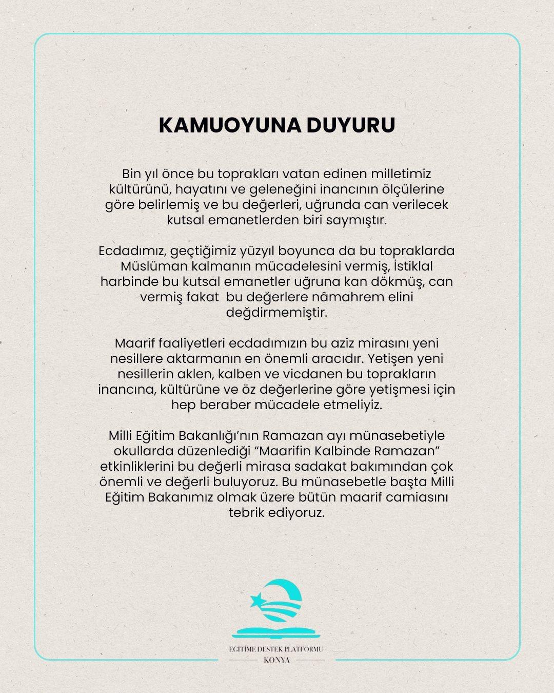 Eğitime Destek Platformu Konya, Milli Eğitim Bakanlığı tarafından Ramazan ayı dolayısıyla okullarda düzenlenen “Maarifin Kalbinde Ramazan” etkinliklerine ilişkin kamuoyuna yönelik bir açıklama yayımladı.