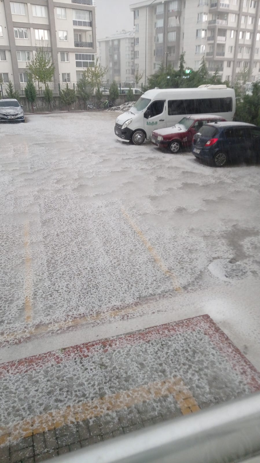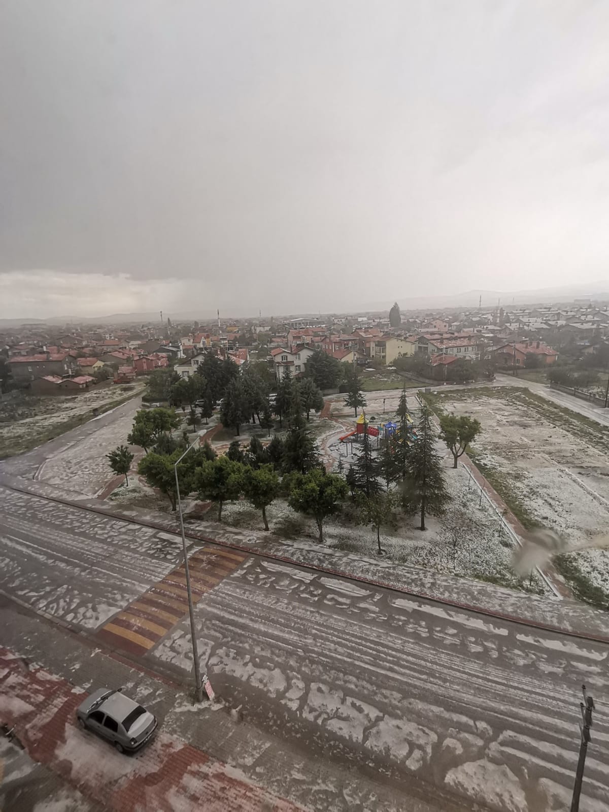 Öte yandan etkili olan sağanak yağmur, doluya dönüştü. Merkez Meram ilçesi Kovanağzı Mahallesi yakınlarında dolu yağışı nedeniyle yollar ve açık alanlar beyaza büründü.