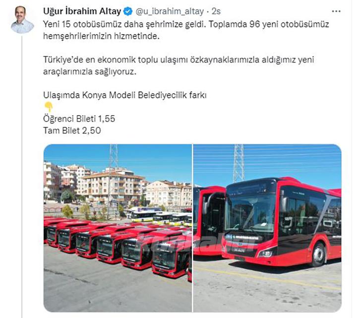 Konya'ya yeni 15 otobüsün daha geldiğini söyleyen Konya Büyükşehir Belediye Başkanı Uğur İbrahim Altay, Konya Modeli Belediyeciliğin farkına dikkat çekerek CHP’li belediyelere ‘bilet’ göndermesi yaptı.