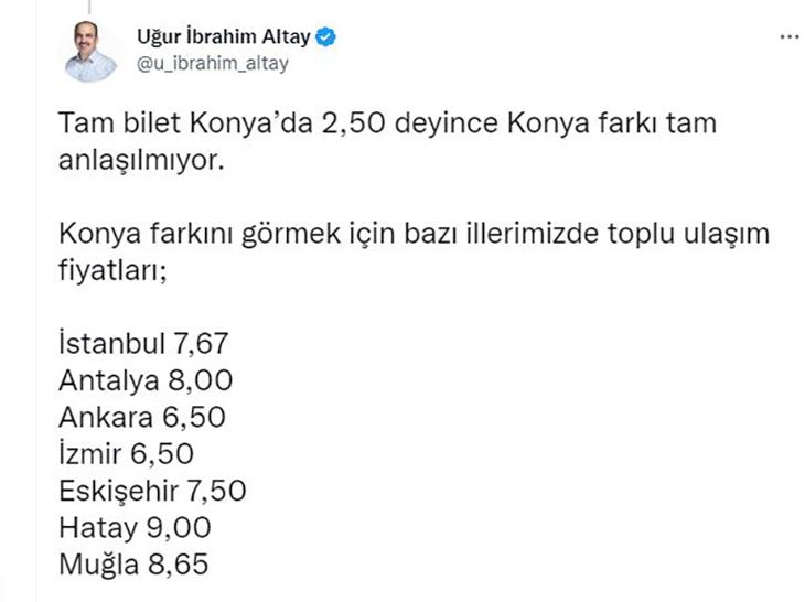 İŞTE KONYA’NIN FARKI“Tam bilet Konya’da 2,50 deyince Konya farkı tam anlaşılmıyor” ifadelerine yer veren Başkan Altay, açıklamasını şu şekilde sürdürdü: “Konya farkını görmek için bazı illerimizde toplu ulaşım fiyatları; İstanbul 7,67, Antalya 8,00, Ankara 6,50, İzmir 6,50, Eskişehir 7,50, Hatay 9,00, Muğla 8,65.”