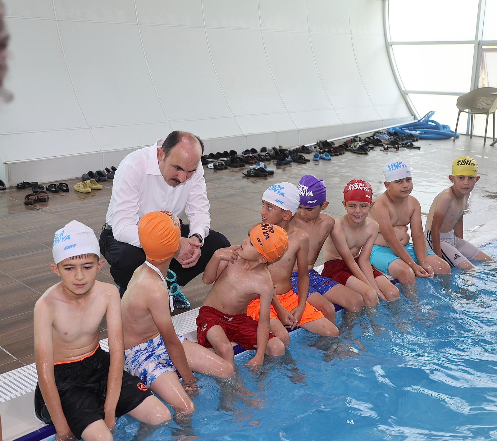 Konya Büyükşehir Belediye Başkanı Uğur İbrahim Altay, yüzme eğitimi için havuza gelen çocuklarla bir araya geldi. Konya’da çocuklar için proje üretmeye devam ettiklerini belirten Başkan Altay, “Yüzme Bilmeyen Kalmasın” projesi kapsamında Meram ve Karatay ile merkezin dışındaki 5 ilçede on binlerce çocuğa yüzme öğrettiklerini söyledi.