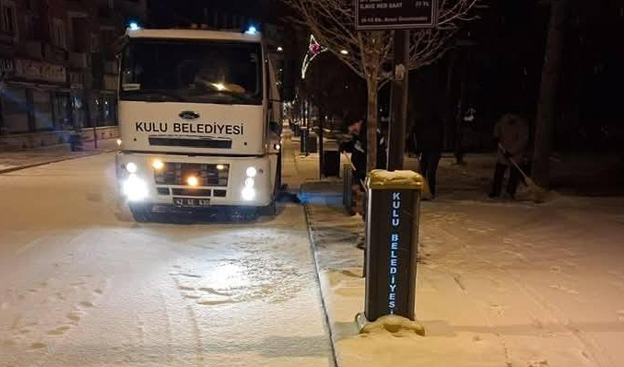 Kulu ilçesinde gece saatlerinde etkisini arttıran rüzgar yerini yağmur ve kar yağışına bıraktı. Kar yağışının ardından belediye ekiplerinin buzlanmaya karşı caddelerde karla mücadelesi çalışması başlattı.