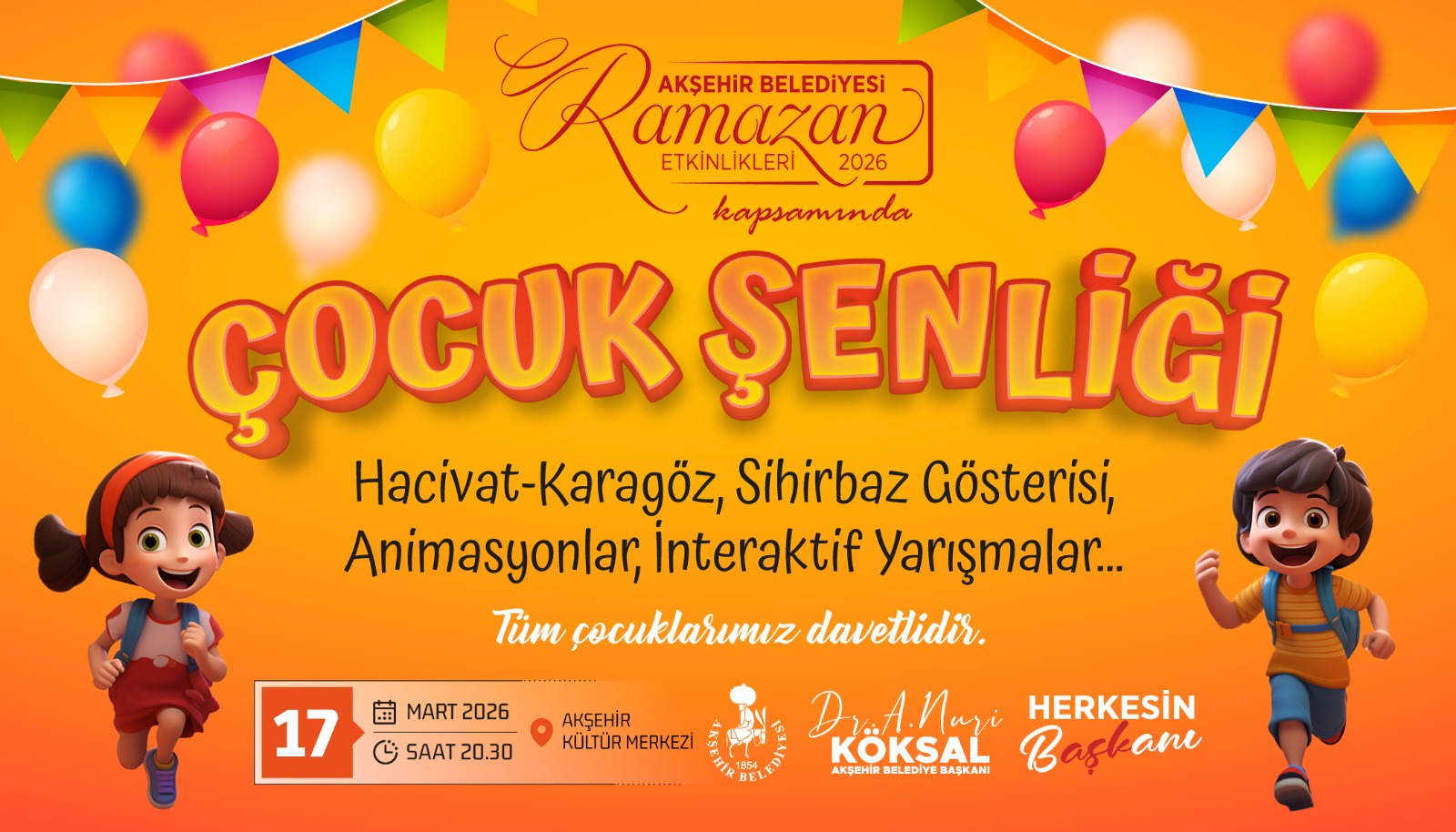 17 Mart 2026 tarihinde saat 20.30’da Akşehir Kültür Merkezi’nde gerçekleştirilecek etkinlikte çocuklar için çeşitli gösteriler ve aktiviteler yer alacak.