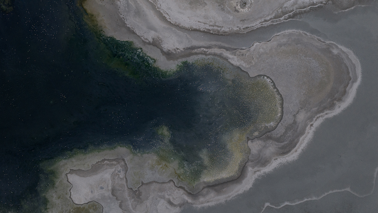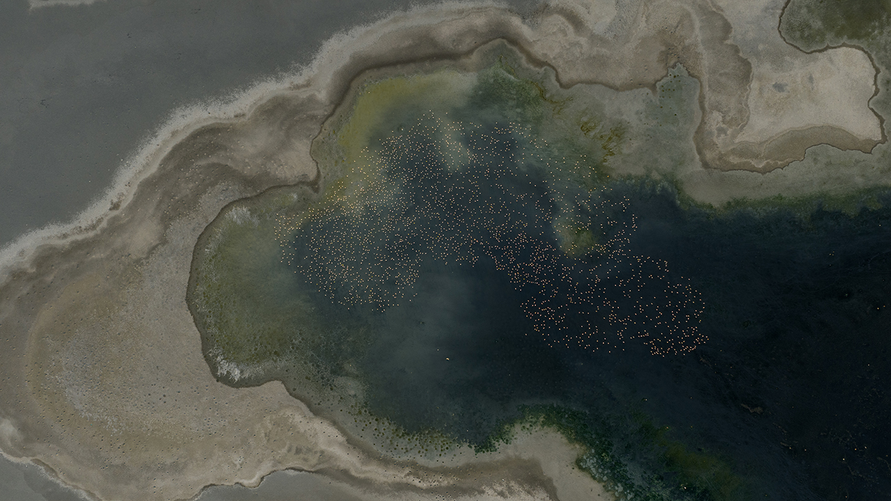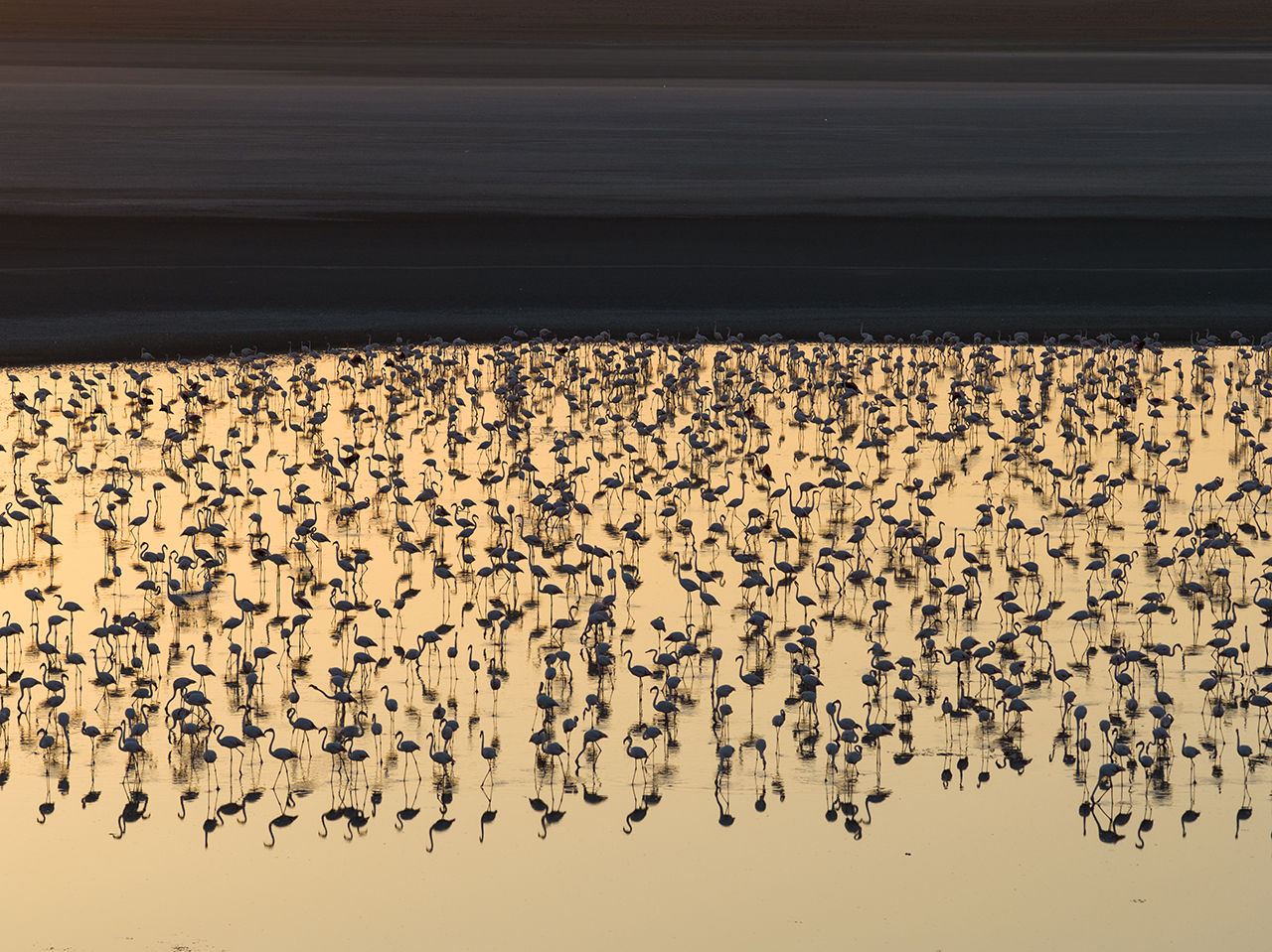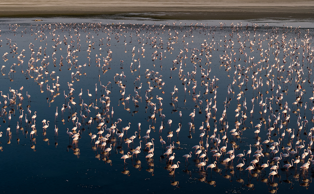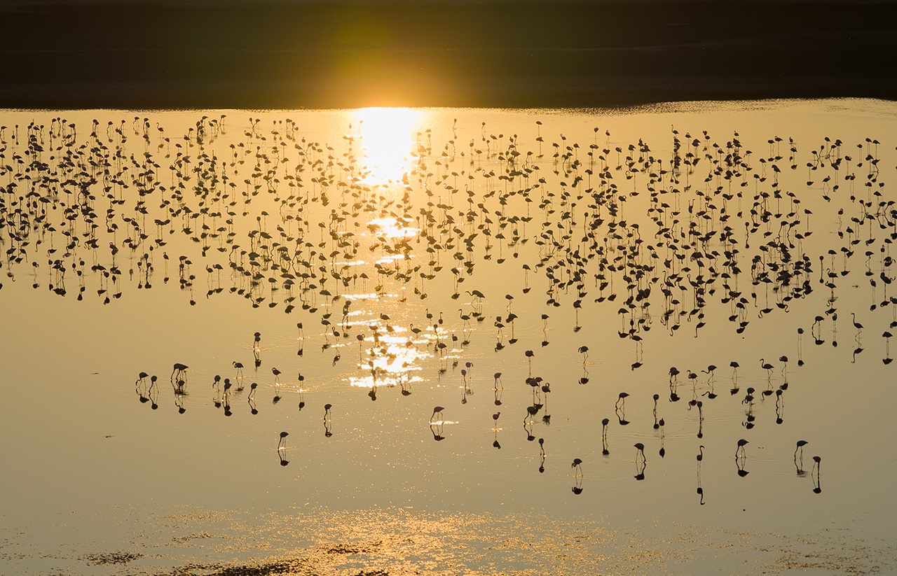 Mevsimsel göçle birlikte göle akın eden flamingolar, sabahın ilk ışıklarıyla birlikte sığ sularda beslenirken güzel manzaralar oluşturuyor.