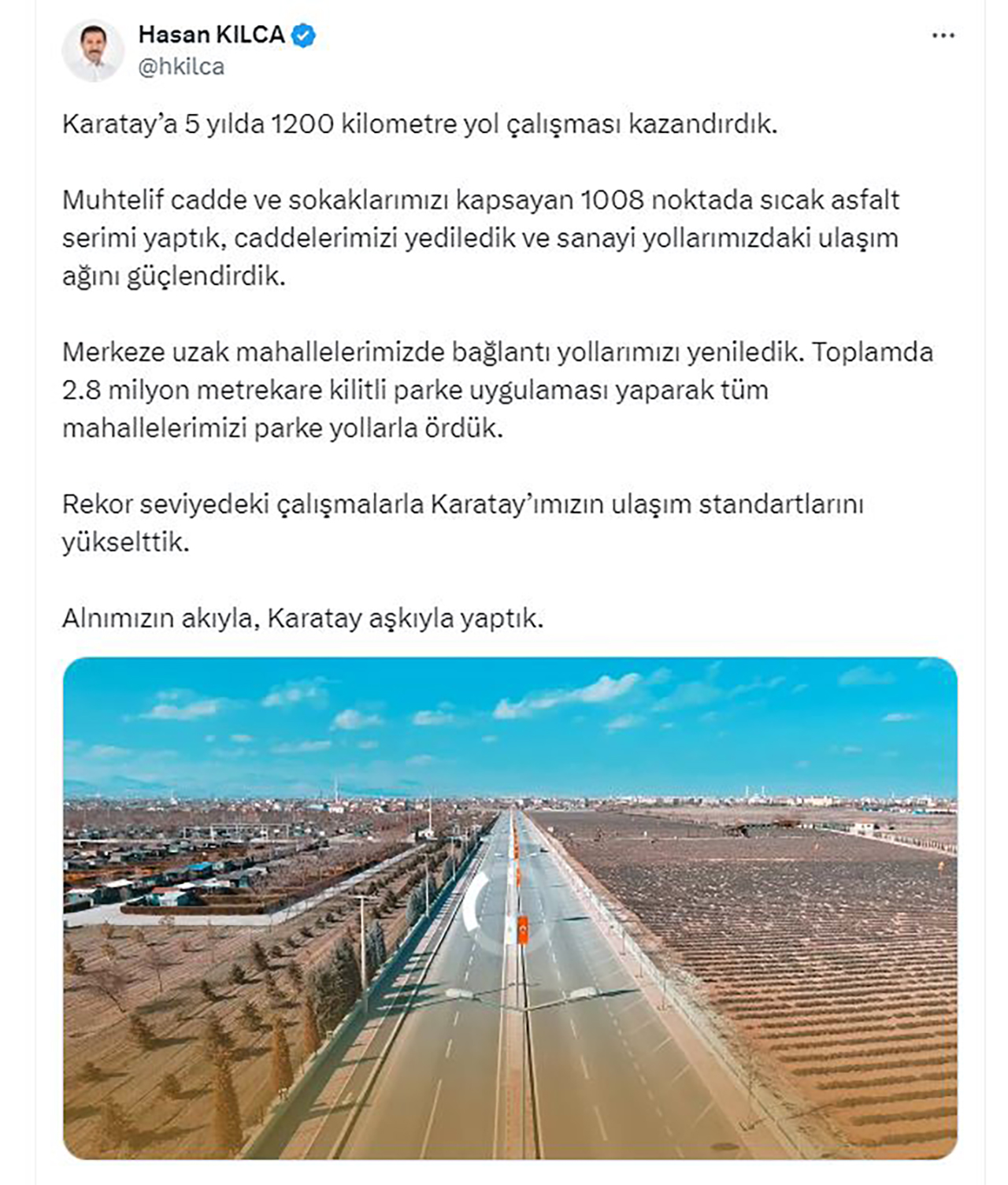 Başkan Hasan Kılca paylaşımında şu ifadelere yer verdi: “ Muhtelif cadde ve sokaklarımızı kapsayan 1008 noktada sıcak asfalt serimi yaptık, caddelerimizi yediledik ve sanayi yollarımızdaki ulaşım ağını güçlendirdik. Merkeze uzak mahallelerimizde bağlantı yollarımızı yeniledik. Toplamda 2.8 milyon metrekare kilitli parke uygulaması yaparak tüm mahallelerimizi parke yollarla ördük. Rekor seviyedeki çalışmalarla Karatay’ımızın ulaşım standartlarını yükselttik. Alnımızın akıyla, Karatay aşkıyla yaptık.” (Yunus Köroğlu)