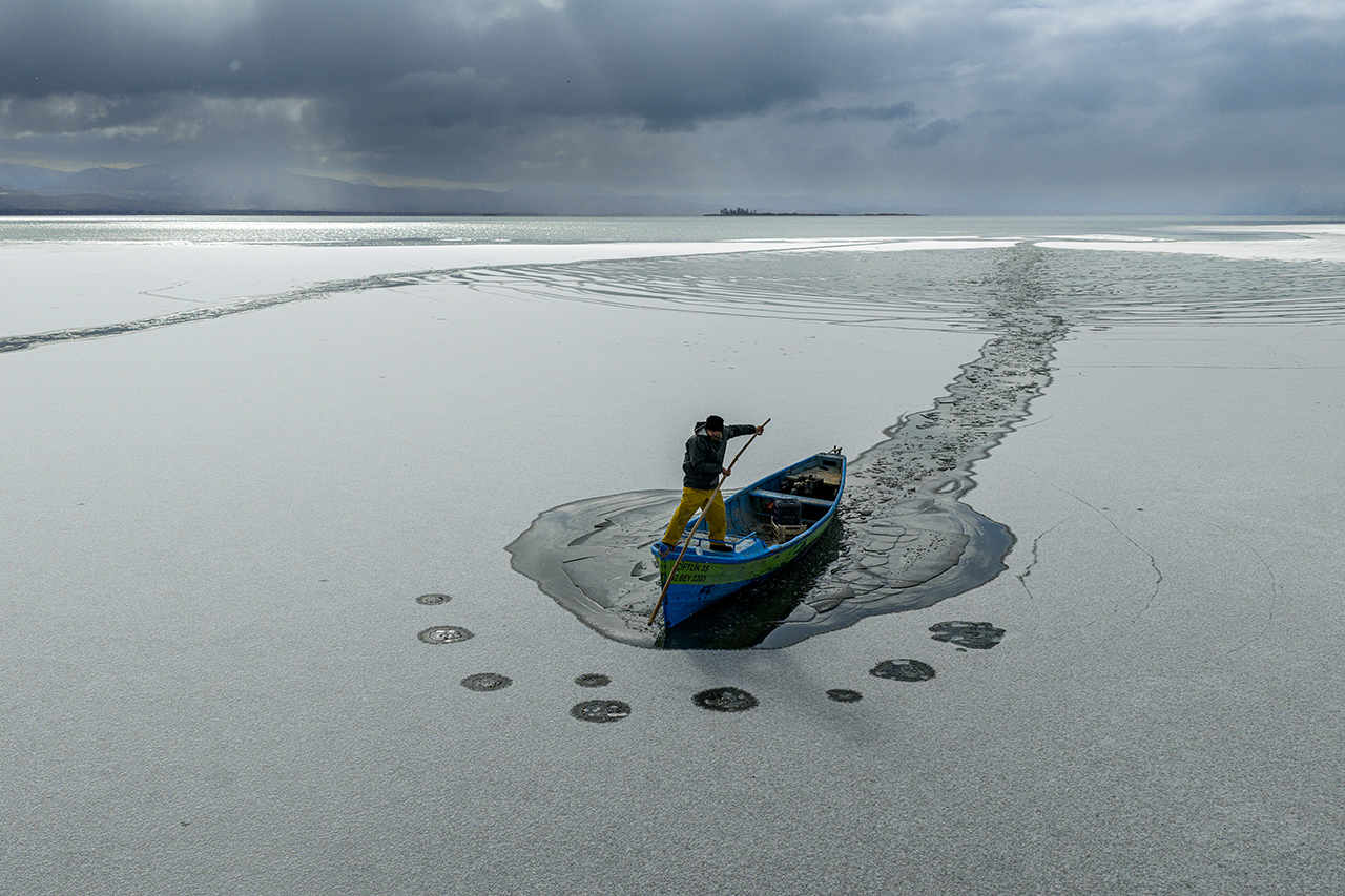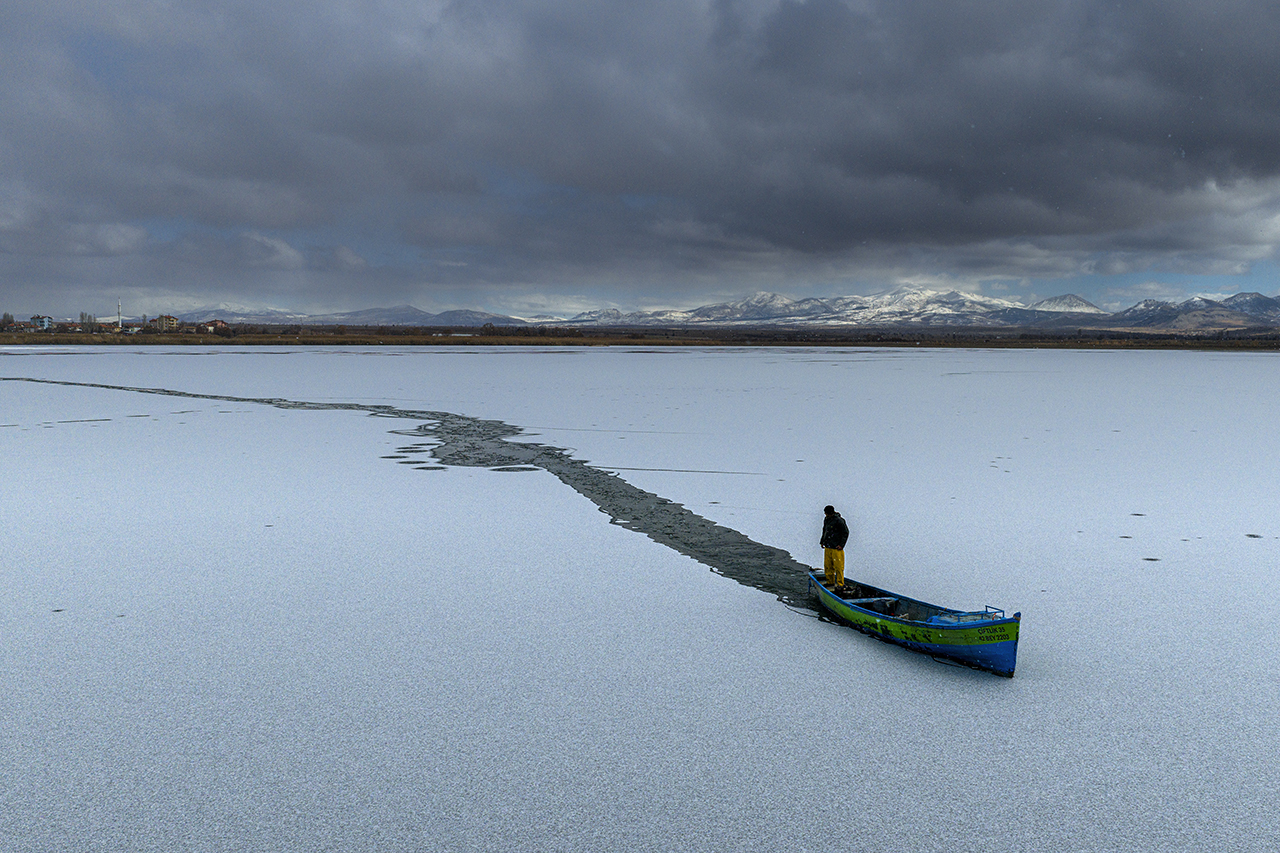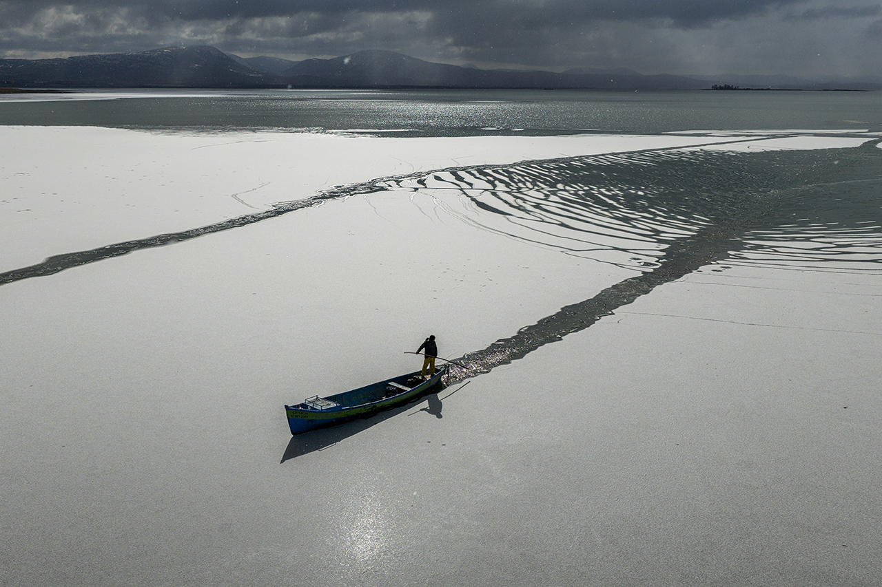 Geçimlerini balıkçılıkla sağlayan göl balıkçıları, zorlu kış koşullarına rağmen avlanmayı sürdürebilmek için buz tutan göl yüzeyini kırarak tekneleriyle suya açıldı.