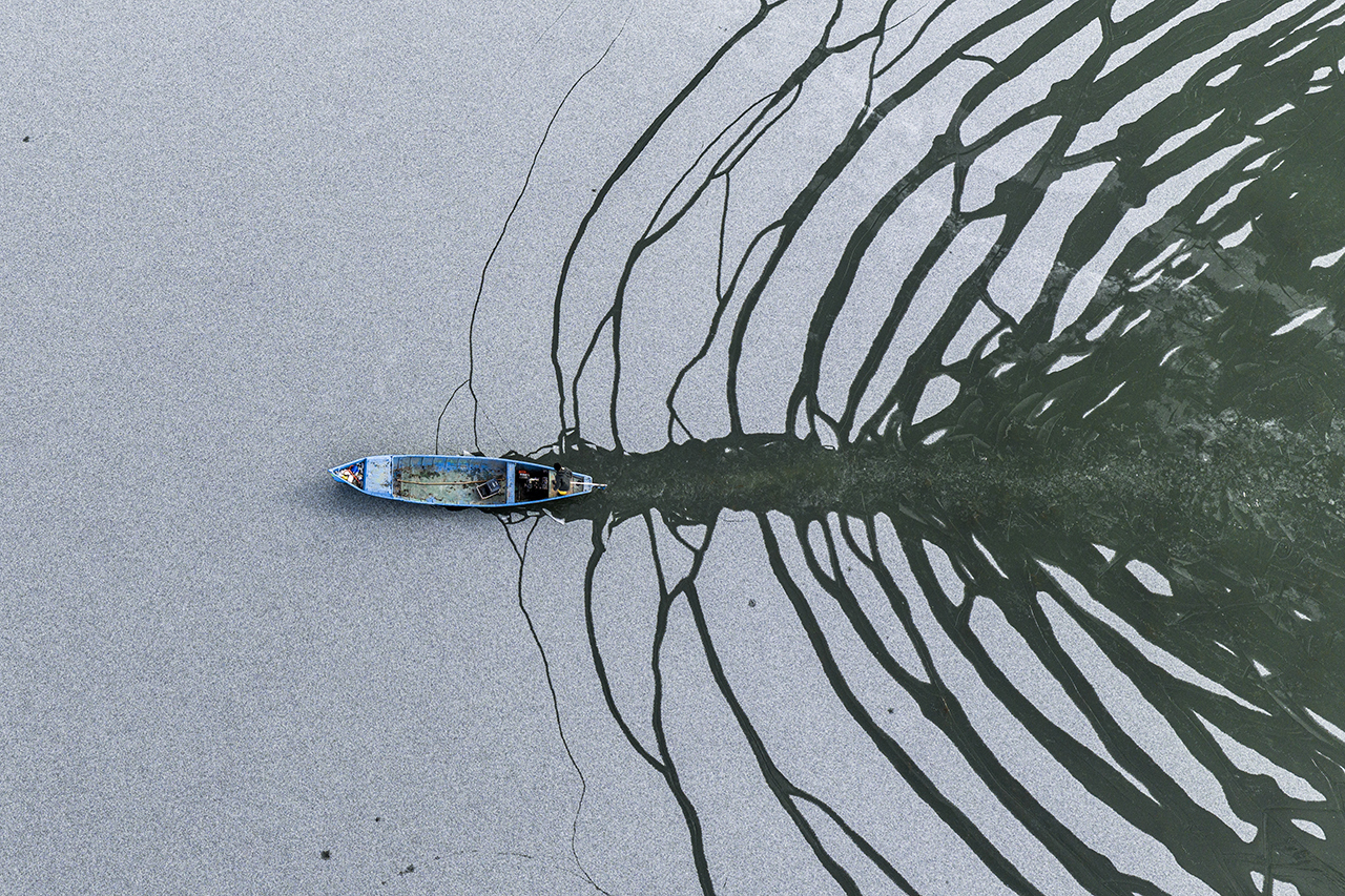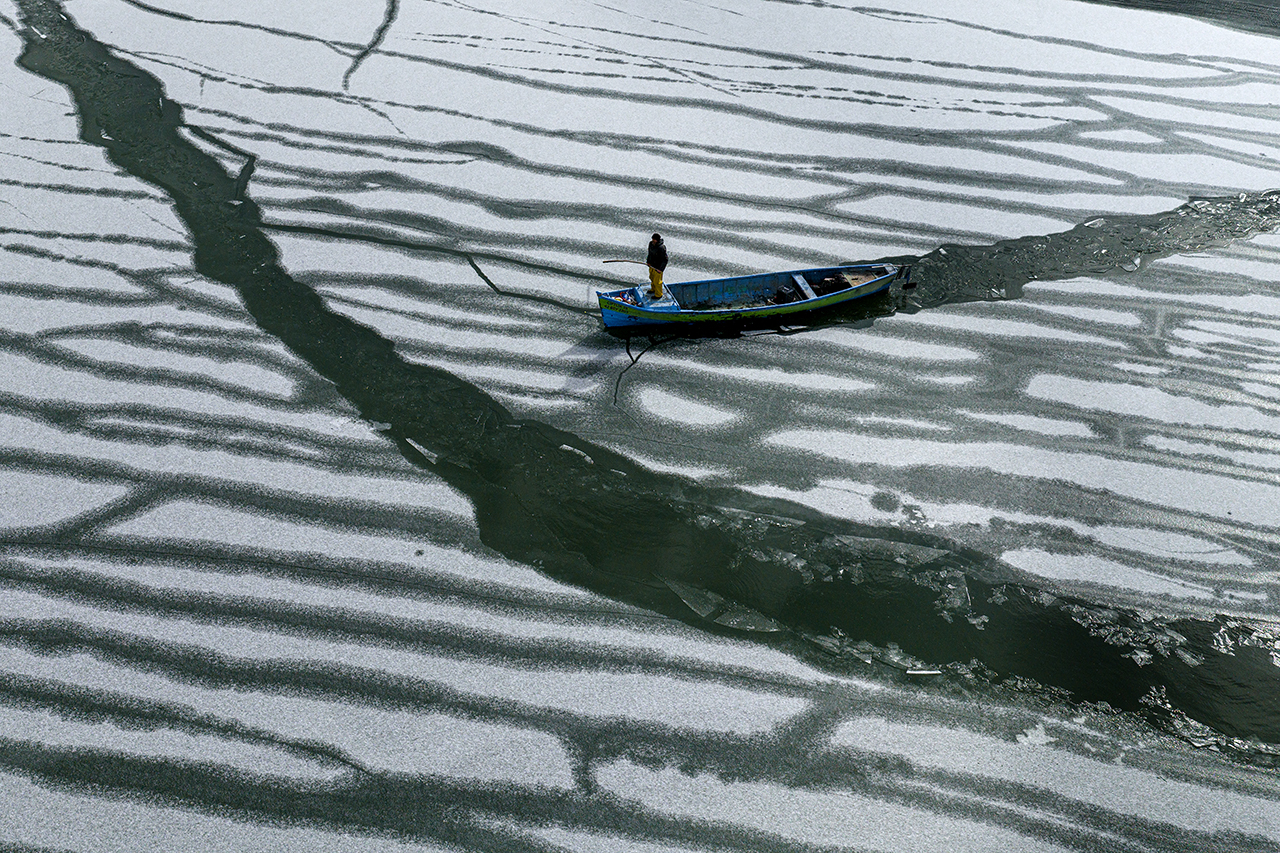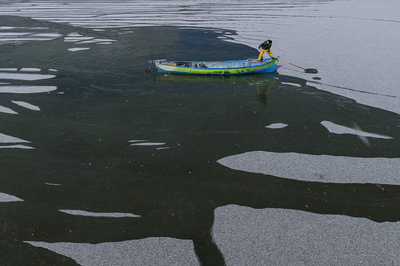 Geçimlerini balıkçılıkla sağlayan göl balıkçıları, zorlu kış koşullarına rağmen avlanmayı sürdürebilmek için buz tutan göl yüzeyini kırarak tekneleriyle suya açıldı.
