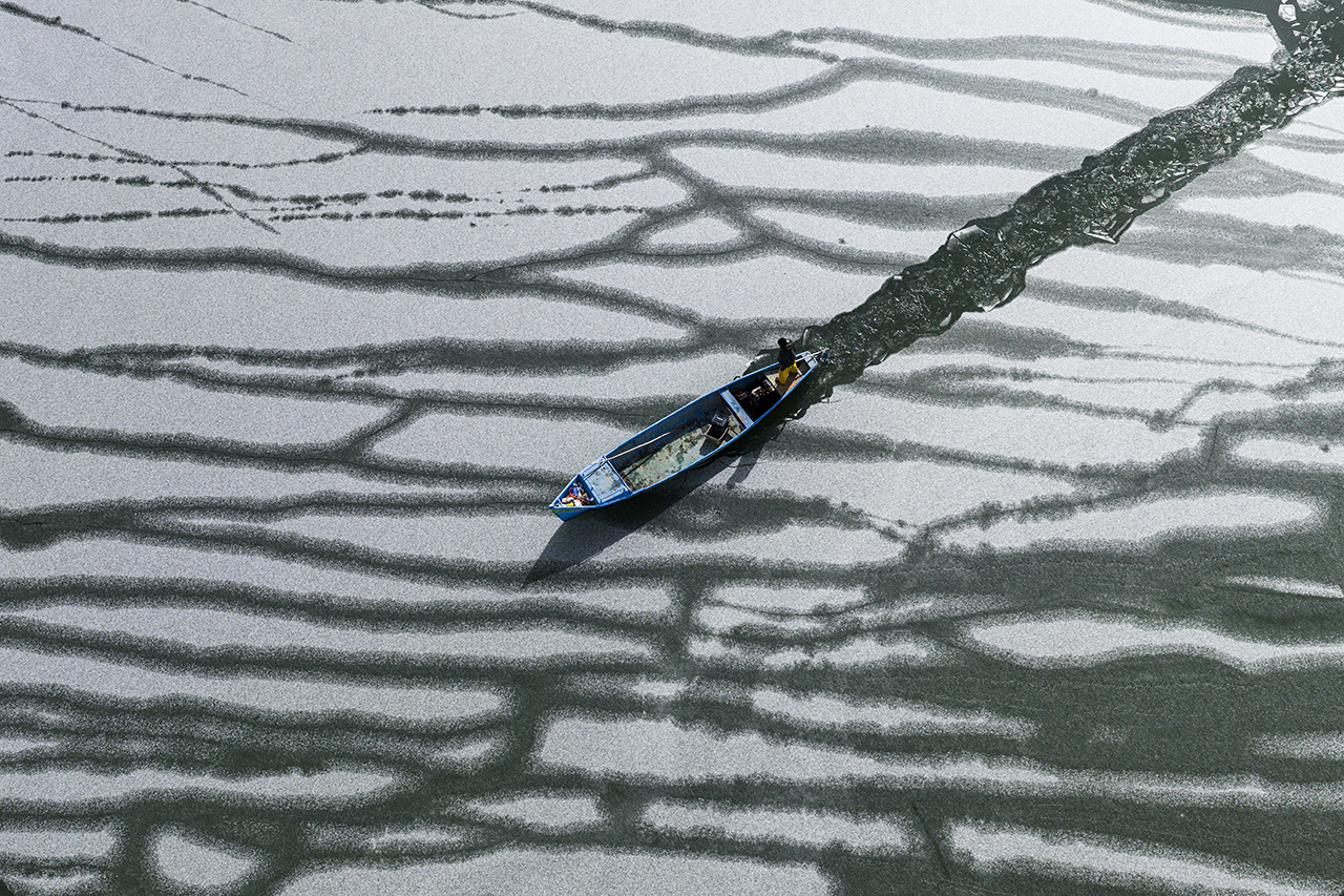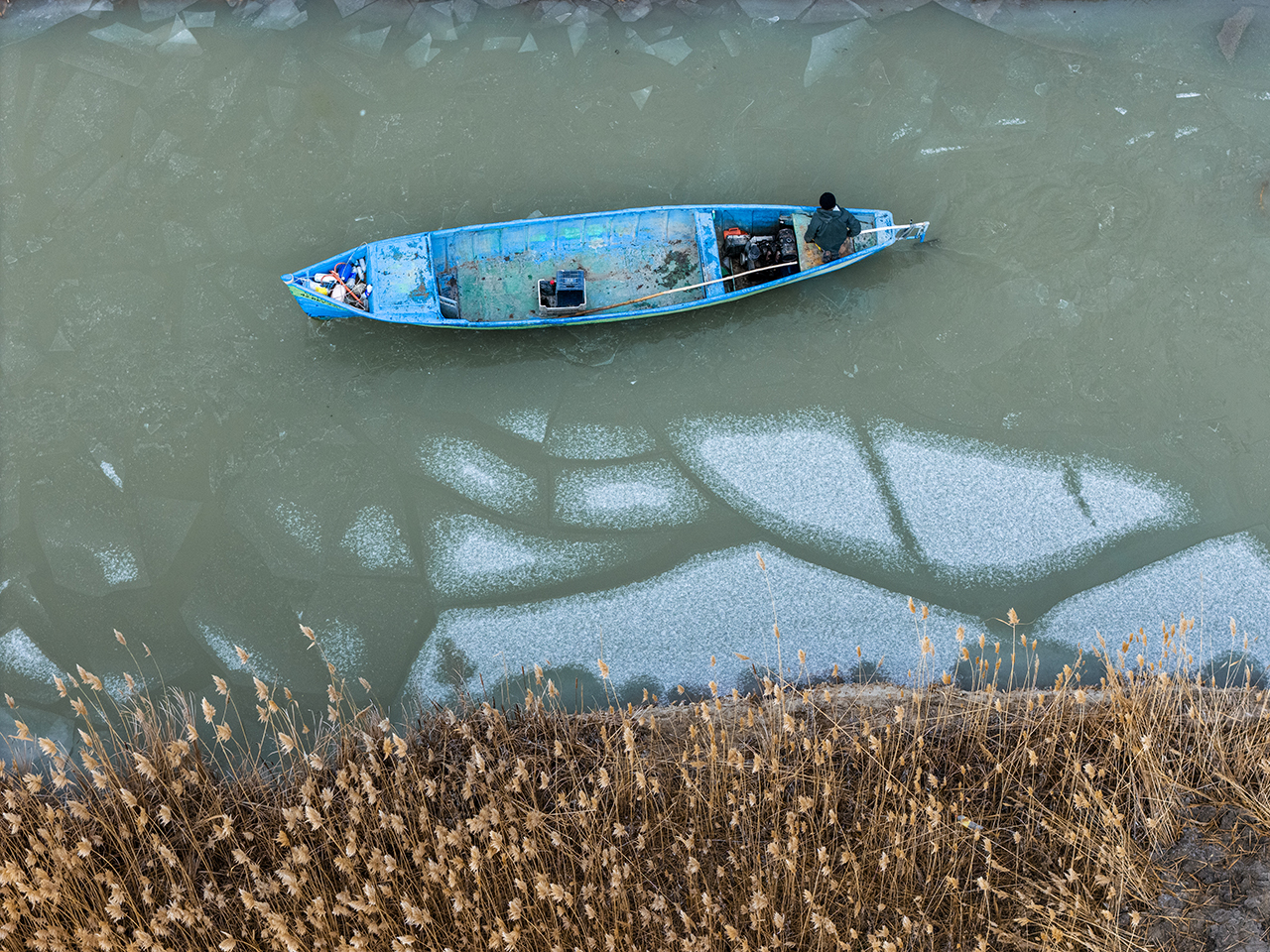 Balıkçıların buzla kaplı gölde verdikleri mücadele havadan görüntülendi.