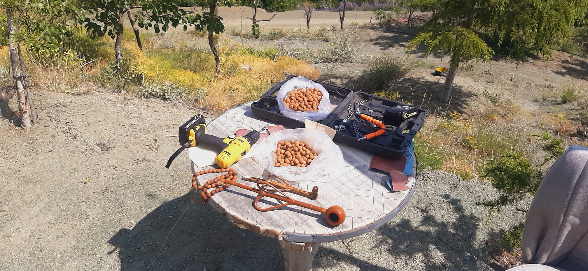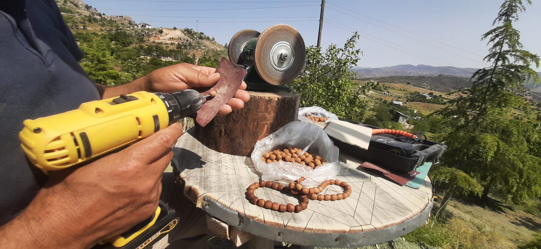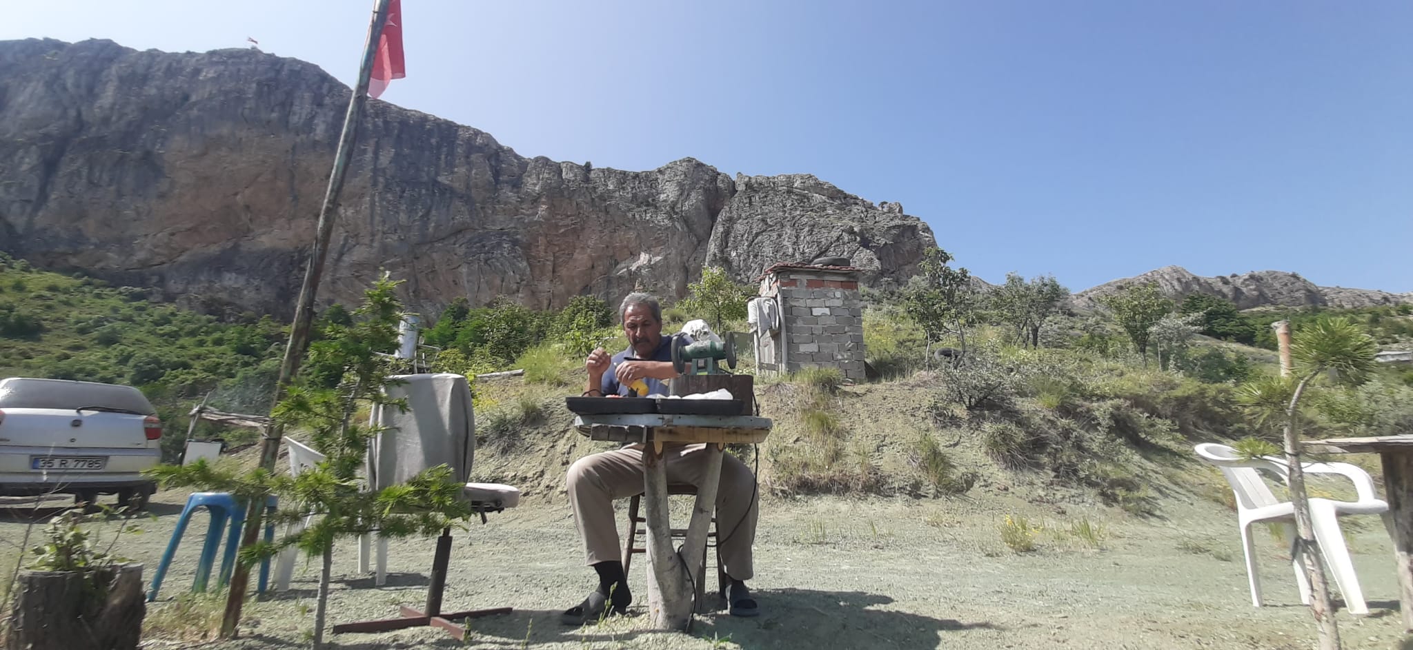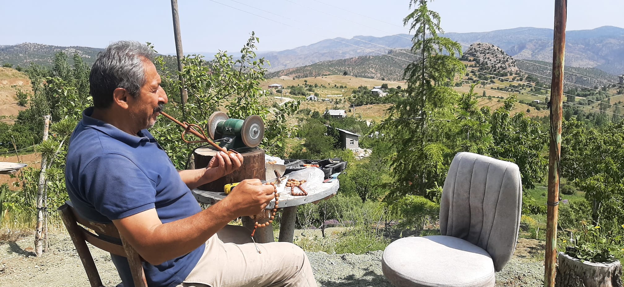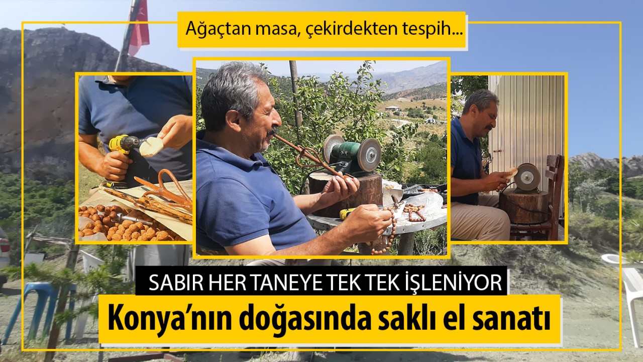 Konya’nın Taşkent ilçesine bağlı Afşar köyünde yaşayan İrfan Sağlam, doğayla kurduğu derin bağ sayesinde sıradan bir bahçeyi adeta bir sanat atölyesine dönüştürdü. Kiraz ağaçlarının arasında kurduğu atölyede, bazen bir ağaç dalı masa ayağına, bazen de zeytin çekirdeği zarif bir tespihe dönüşüyor.