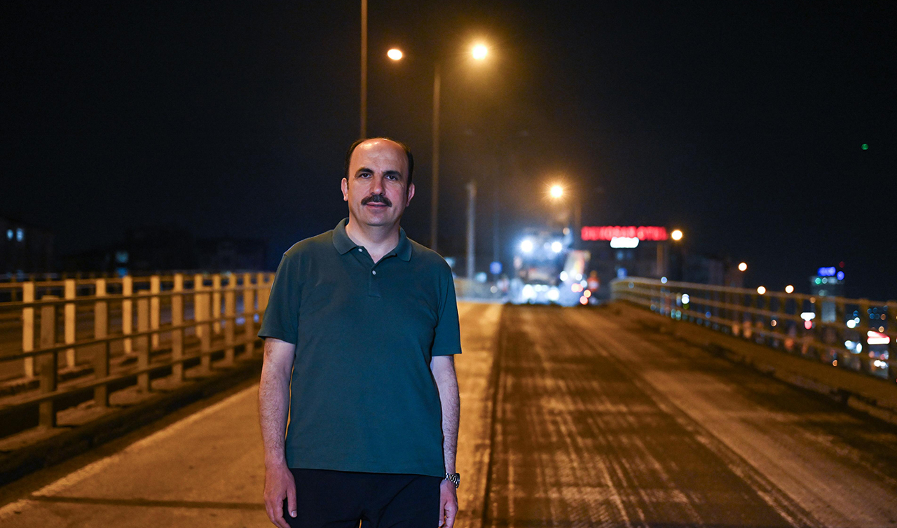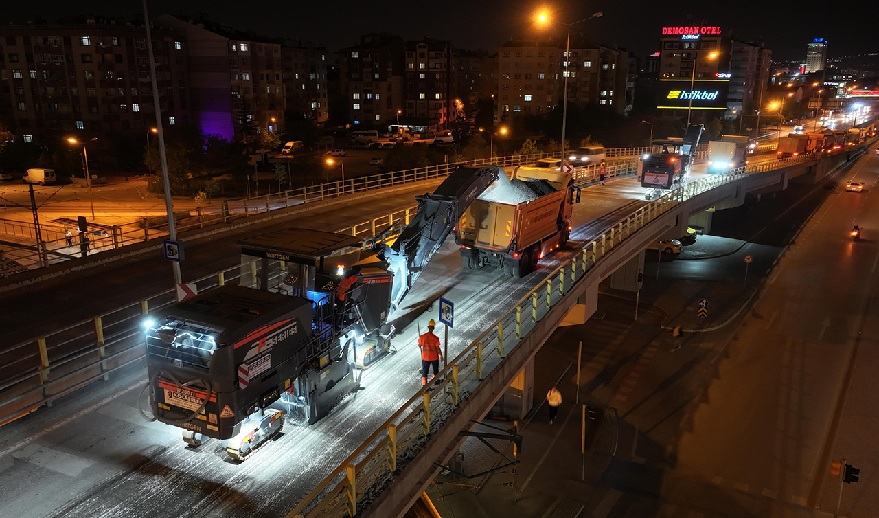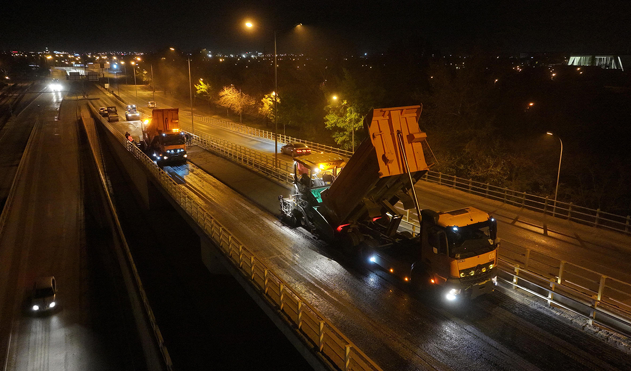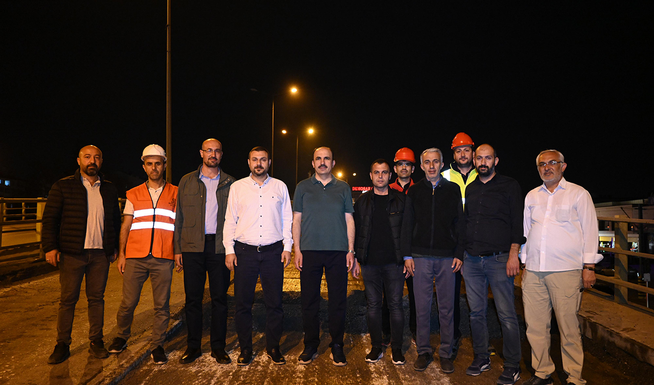 Konya’nın en yoğun kavşaklarından biri olan Koyuncu Köprülü Kavşağı’nda da asfalt yenileme çalışması başlattıklarını ifade eden Başkan Altay, “Üst geçitte arkadaşlarımız yoğun bir şekilde çalışıyor. Şu anda saat 11.35. Sabah 06.00’ya kadar buradaki çalışmaları tamamlamak için 30 araç ekipman ve çalışanlarımızla yoğun bir gayret içerisindeyiz. Amaç günlük trafiği rahatsız etmeden şehrimizi yenilemek. İnşallah şehrimizdeki bu çalışmaları sezon boyunca devam ettirip Konyalılara daha konforlu bir ulaşım sağlamayı hedefliyoruz. Gecenin bu saatinde yoğun bir gayret gösteren tüm çalışma arkadaşlarıma teşekkür ediyor, kolaylıklar diliyorum” diye konuştu.